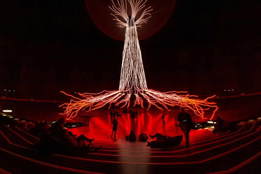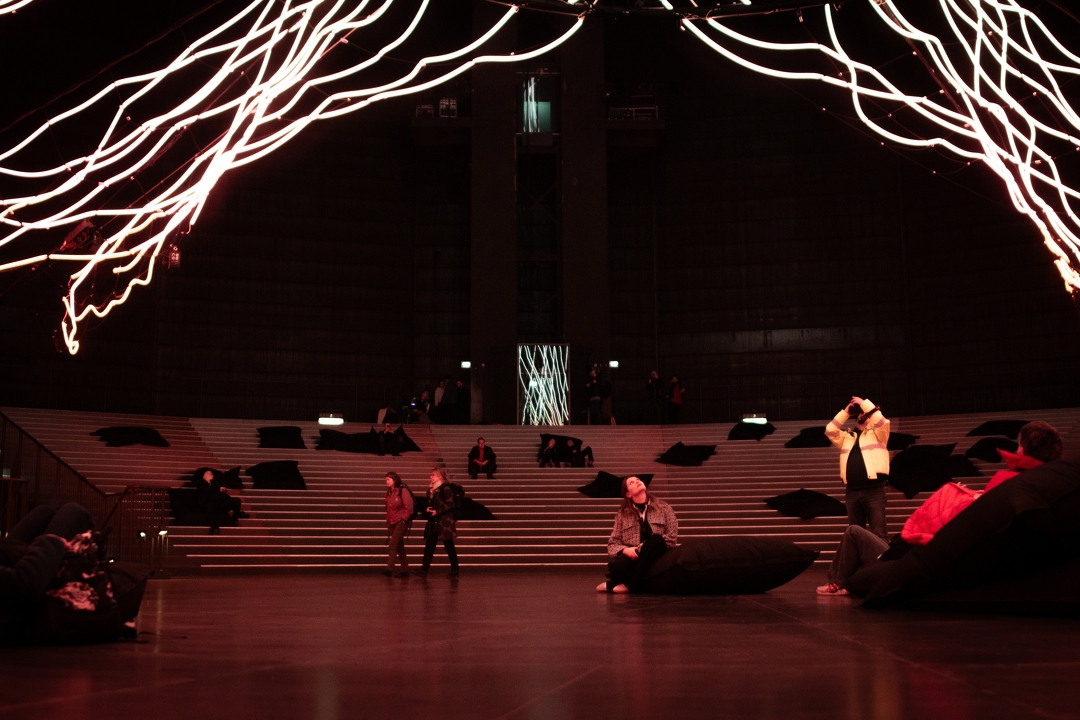 Eines dieser Kapitel trägt den Namen Komorebi – ein japanisches Wort für Sonnenlicht, das durch Blätter fällt. Wurzeln und Stamm leuchten in warmen Farben, während Lichtstrahlen durch die Äste blitzen und den Raum in sommerliches Licht tauchen. Die eigens vom Pianisten und Komponisten Rupert Huber gestaltete Musik begleitet die Installation durch alle Kapitel und verstärkt das Zusammenspiel von Raum, Licht und Klang. Der industrielle Raum des Gasometers verstärkt das immersive Erlebnis: An einem Ort, der einst der Speicherung und Nutzung von Energie diente, wird mit „Der Baum“ ein anderes Verständnis von Energie erfahrbar – nicht als Ressource, sondern als lebendiges Netzwerk von Beziehungen.