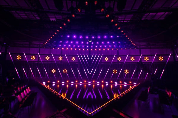 Die impression FR1 dienten dabei in erster Linie dazu, die Bühnenform im Rigg nachzuzeichnen und zu betonen. Darüber hinaus wurden sie auch am Boden an den Schenkeln der Dreiecke als zusätzliche Kantenbetonung integriert.