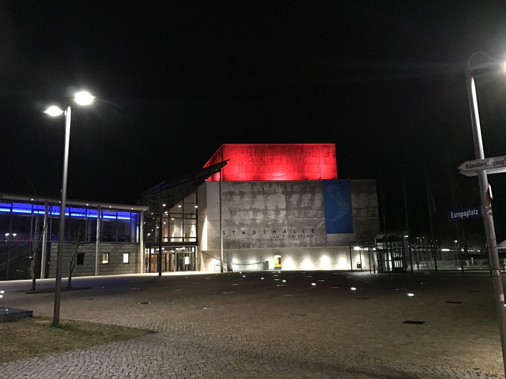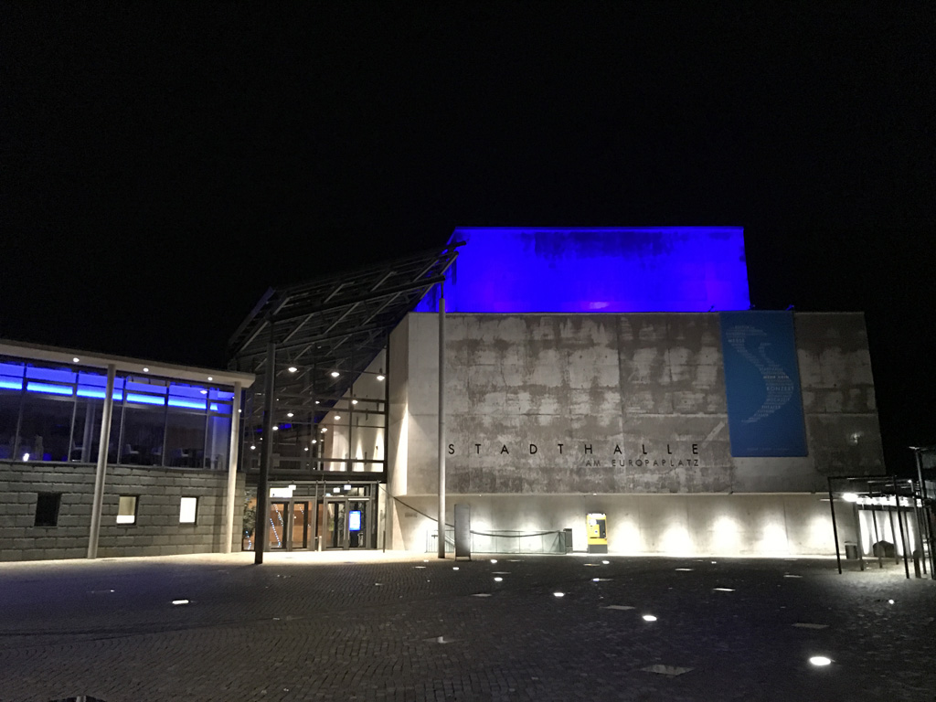Die 18 × 440W LED-Fluter wurden auf dem Vordach rund um den Bühnenturm der Stadthalle installiert und können den 5-6 m hohen Turm nach Wunsch in Farbe oder unterschiedlichen Weißtönen beleuchten.