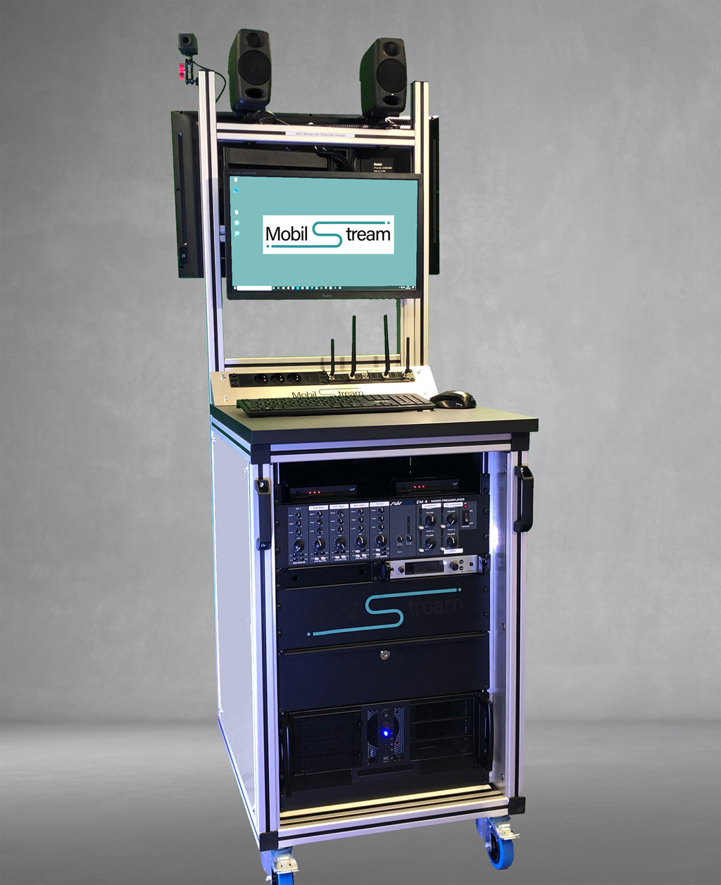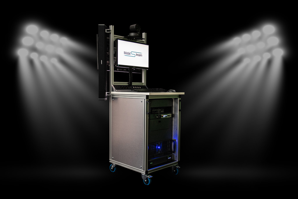 Alle Komponenten von Mobil Stream sind in einem Fahrwagen verbaut, so dass das System  mobil einsetzbar ist. Nur ein Stromanschluss und ein offener Internetanschluss sind damit für die Online-Veranstaltung nötig.
