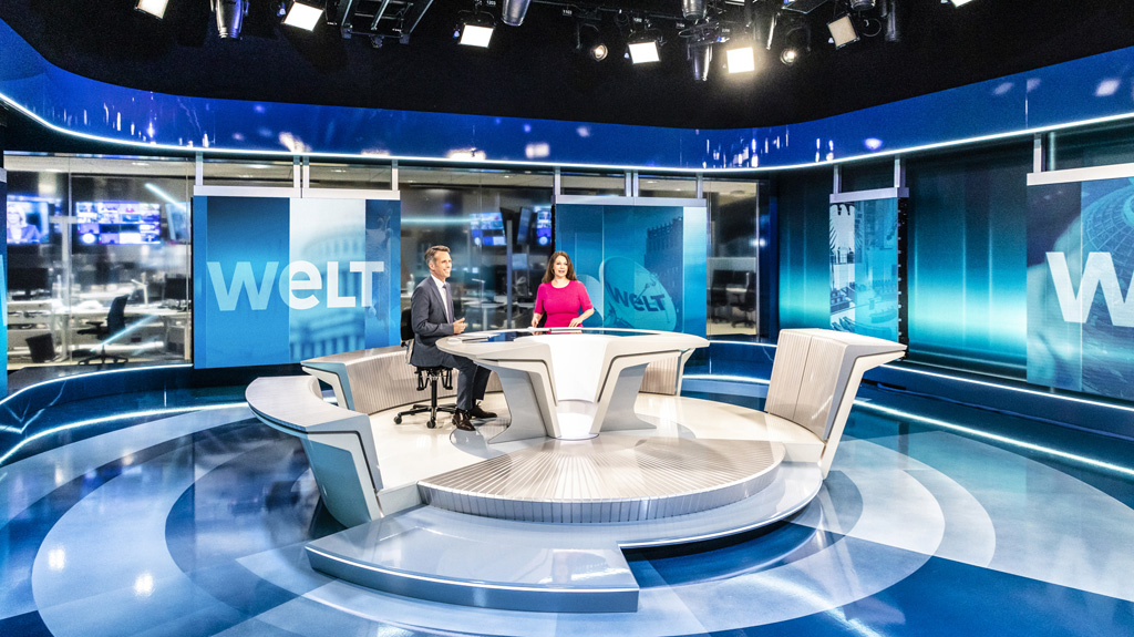 Die beiden TV-Studios von WELT sollen eine engere Vernetzung und Zusammenarbeit mit Digital und Print ermöglichen. Dieser Austausch spiegle sich auch im visuellen Konzept der jeweils 175 m² großen, 5,5 m hohen Studios wider. So sorgen Glasfronten im Studio 1 für Transparenz, Sichtbarkeit und Interaktion. Besondere Herausforderungen für das Lichtdesign sind dabei auch die an drei Seiten motorisierten, mobilen LED-Videopanels und ein geforderter Mindestbewegungsspielraum für die Moderatorinnen und Moderatoren innerhalb der Sets ohne Änderung der Scheinwerferpositionen.