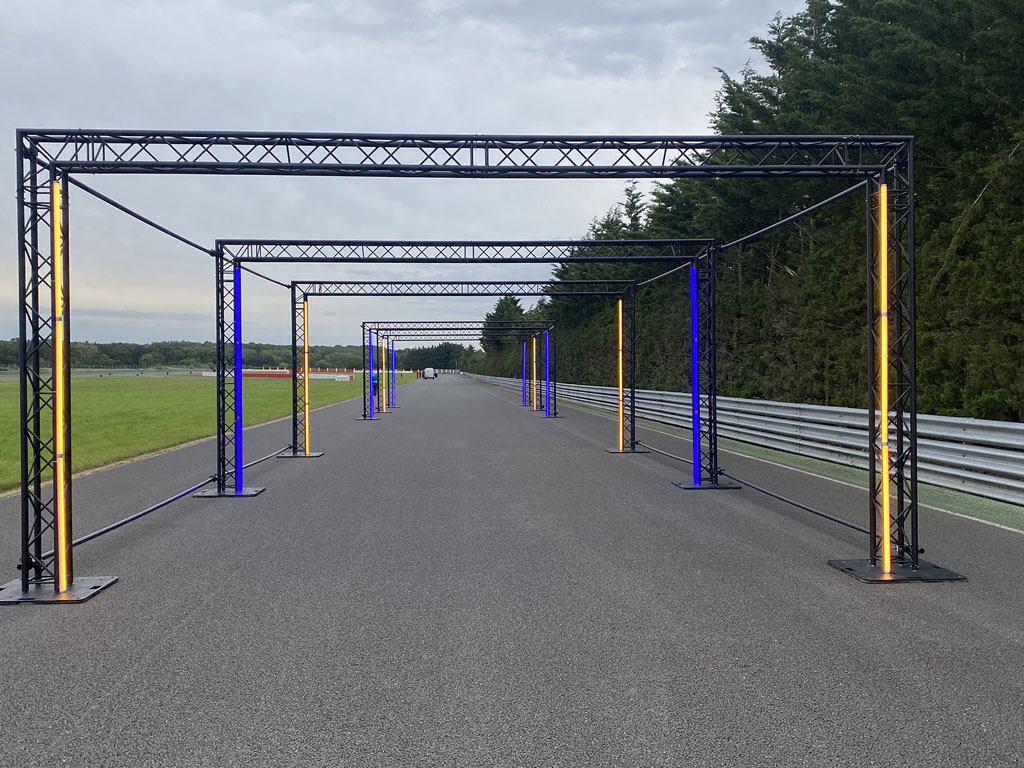 Auf der Strecke war es eine kontrastreiche Umgebung, aber Nick veranschaulichte die Flexibilität von Astera im Allgemeinen, indem er dieselben Titan-Röhren anders einsetzte. Er und sein Team bauten sechs 6 m breite und 4 m hohe Torpfosten, von denen jeder mit sechs Titan Tubes eingefasst war – drei pro Torpfostenbein – um das Auto hervorzuheben. „Sie sind so vielseitig und ein großartiges Produkt“, schwärmte Nick von den Titan Tubes und fügte hinzu: „Die Möglichkeit, sie sowohl im Studio als auch unter freiem Himmel einzusetzen, zeigt, dass es sich nicht nur um ein großartiges ästhetisches Produkt handelt, sondern dass es wirklich einen fantastischen Wert hat!“ Im Studio wurden die Titans kabelgebunden betrieben und über Nicks eigene Avo Quartz-Konsole gesteuert. Auf der Strecke nutzte er die Vorteile des kabellosen Betriebs von Astera, indem er die lokale Steuerung auf der Rückseite der Geräte zur Einstellung der Farben verwendete.