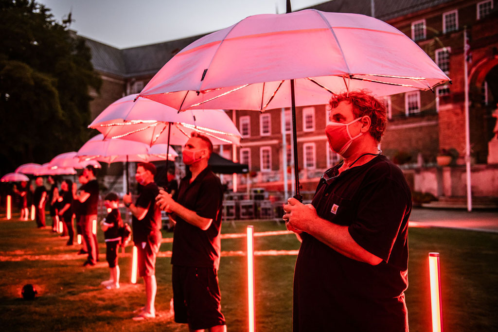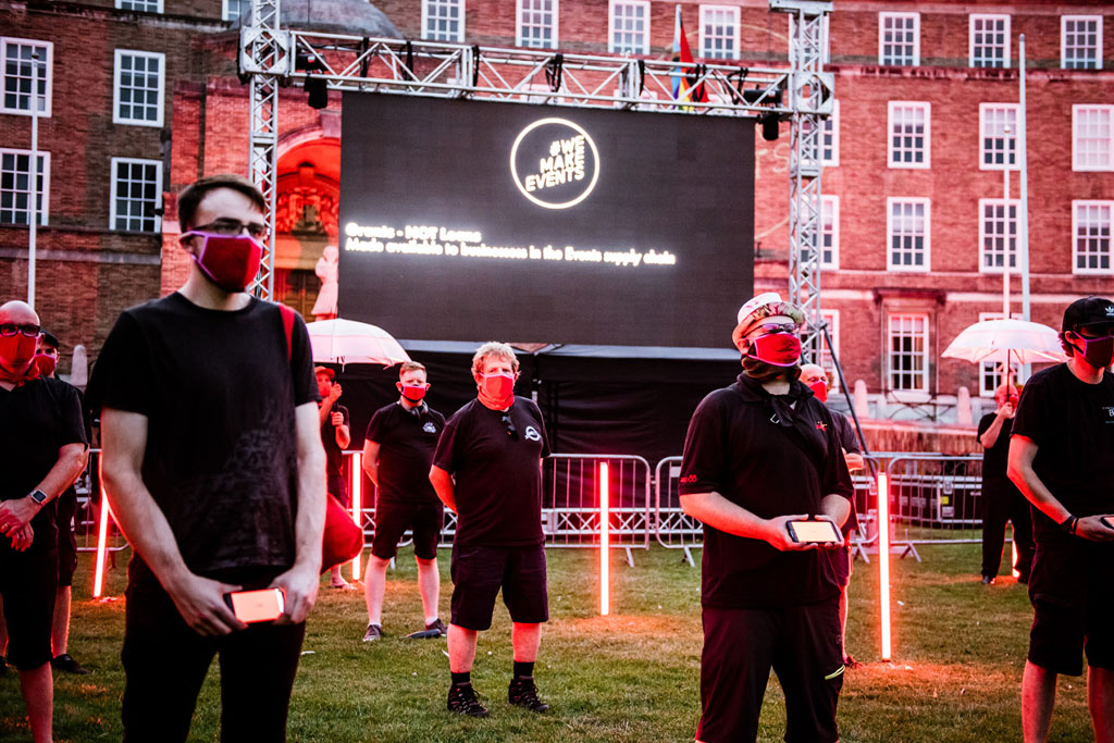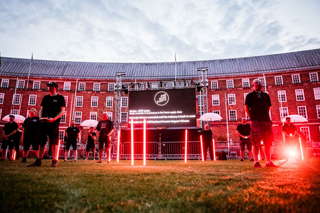 In „One-hundred Unseen“ wurden 100 Veranstaltungsprofis zur Teilnahme an der Kunstaktion eingeladen – gekleidet in Schwarz mit roten Masken, standen sie in auf Abstand und in Formation auf dem College Green, einem der prominentesten Orte in Bristol. Das symbolträchtige Stück repräsentierte die unsichtbare Natur von Technikern, die in allen Disziplinen von Produktionen, Shows und Veranstaltungen arbeiten.