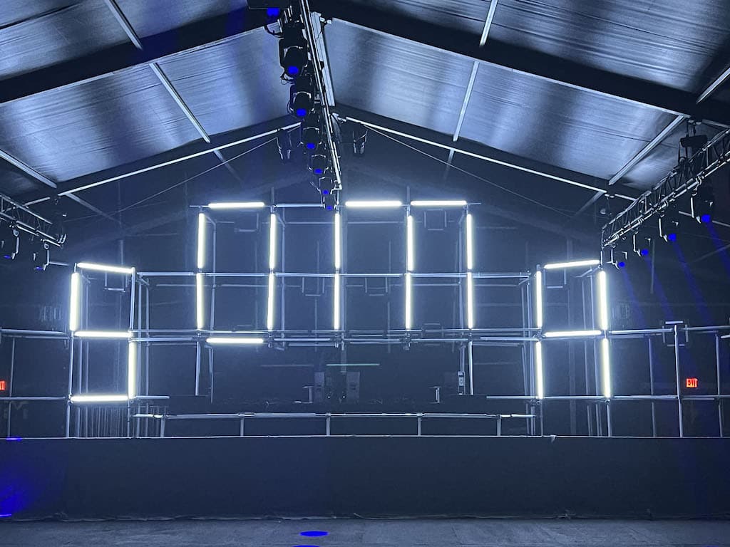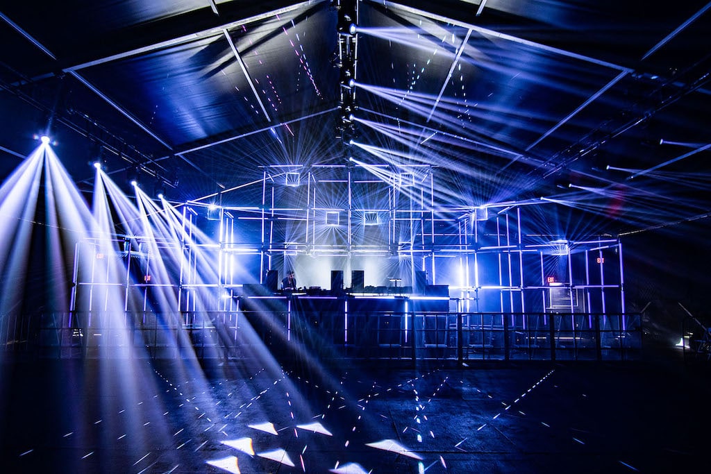 Um das DJ-Pult herum wurde ein facettenreiches Speed-Rail-Gerüst gebaut, an dem Titan-Röhren angebracht waren, die es von einem Metallgerüst in ein dreidimensionales Kunstwerk verwandelten, das Abenteuerlust mit struktureller Eleganz verbindet.