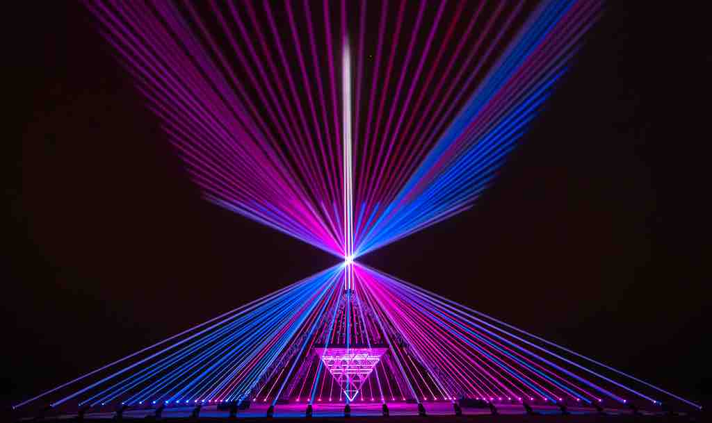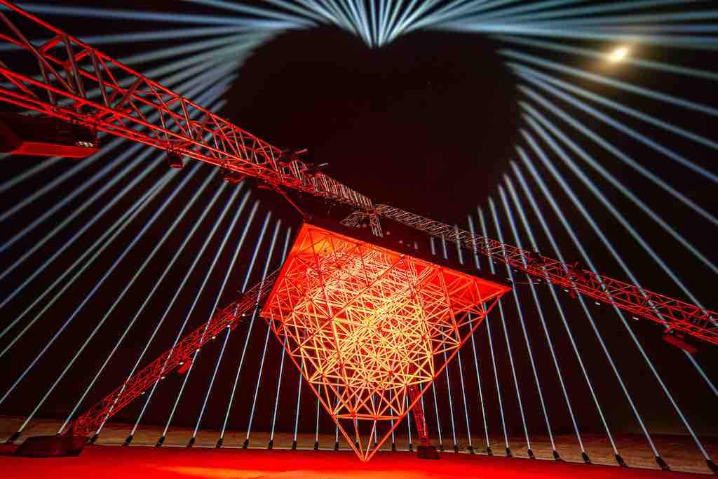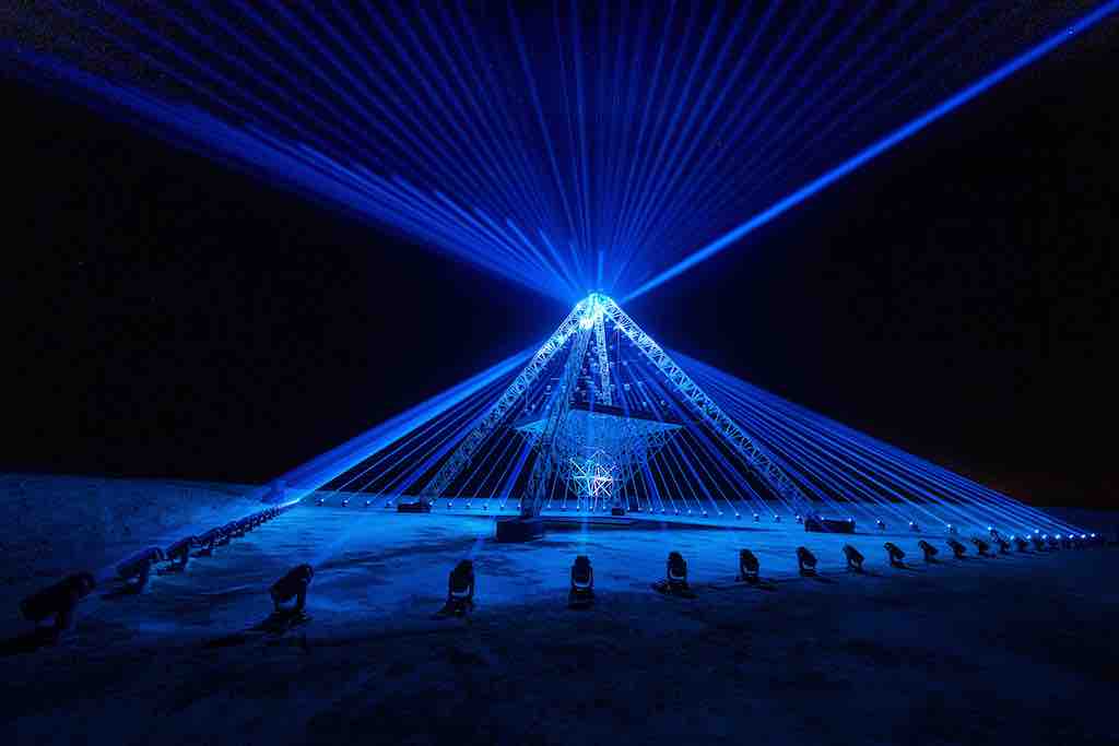 „Innerhalb der Installation gibt es drei Schichten von Lichtern, die je nach Nähe des Besuchers eine völlig andere Erfahrung des Werks ermöglichen. Der Kern der Installation besteht aus 360 LED-Röhren, die in Form einer umgedrehten Pyramide angeordnet sind, unter die sich die Besucher legen können, um sie aus nächster Nähe zu erleben. Die nächste Lichtebene ist an einer 18m hohen pyramidenförmigen Traverse angebracht, die die LED-Pyramide trägt und den Raum unter der Traverse sowie 32 Spiegelkugeln über dem Dach der Pyramide beleuchtet. Diese Ebene kann erkundet und erlebt werden, indem man innerhalb und außerhalb der Traversenpyramide spazieren geht.“