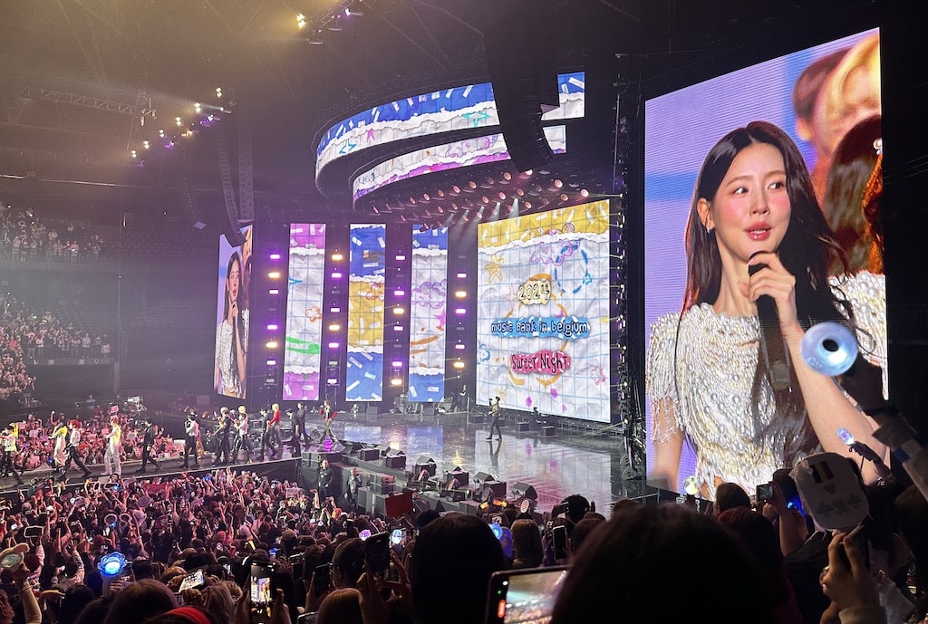 K-Pop-Festival in Antwerpen mit LED-Displays von Innlights Displaysolutions mit einer 10 x 10 m großen teiltransparenten Bildfläche im Center der Bühne, flankiert von großen seitlich angeordneten LED-Walls und weiteren LED-Bildstreifen