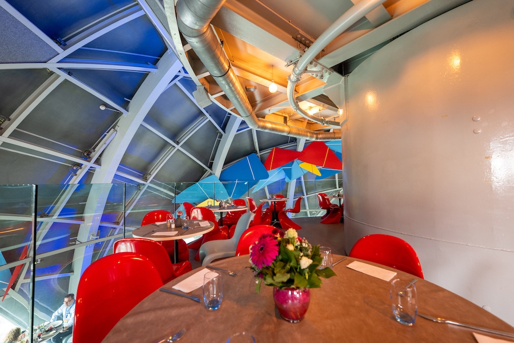 Das Restaurant befindet sich in der obersten Kugel und bietet auf zwei Ebenen bis zu 100 Menschen Platz. Im kreisförmig angeordneten Restaurant wurden insgesamt 12 Lautsprecher des Typs IS6T-WP, 2 Lautsprecher des Typs IS26T-WP, ein IS8S-WP Subwoofer und ein IS12S-WP Subwoofer installiert. Alle Einheiten wurden im Restaurant in der Stahlkonstruktion strategisch platziert, um eine gleichmäßige Beschallung zu gewährleisten. Die Einmessung der Beschallung ist bedingt durch die Kugelform des Raumes eine besondere Herausforderung. Ein weiteres erwähnenswertes Merkmal dieser Installation ist die farbliche Anpassung der Lautsprecher an die historische Stahlkonstruktion des Gebäudes durch den Technikdienstleister Diffusion Event und Inhaber Benjamin Moreas, der für die Installation verantwortlich zeichnet.