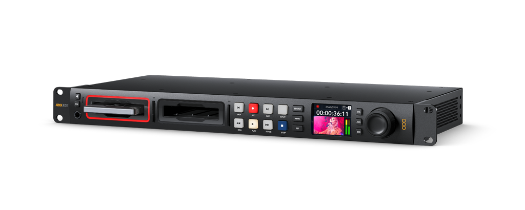 Der HyperDeck Studio HD Pro mit vollem Rack bietet SD- und SSD-Steckplätze sowie ein Suchrad mit Kupplung