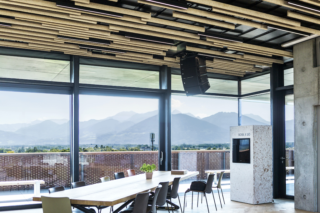 Das Unternehmen BORA, das die Kochfeldabzugssysteme für Küchen in Privathaushalten und Gastronomie erfunden hat, bezog kürzlich seinen neuen Firmensitz im bayerischen Raubling, wobei der Umbau über einen Architekturwettbewerb ausgeschrieben wurde. Das Gebäude wurde unter Berücksichtigung ressourcenschonenden Bauens komplett umgebaut, eine intelligente Fassade errichtet und um einen 9. Stock erweitert. Im obersten Stock wurde ein Multifunktionsraum integriert, der unter anderem auch als Mitarbeiterkantine fungiert. Dort finden BORA-Produktpräsentationen aber auch Events von Fremdfirmen statt. Um dem Raum auch die klanglichen Möglichkeiten einer universellen Nutzung zu geben, entschied sich BORA-Gründer Willi Bruckbauer mit dem ausführenden Installationsunternehmen Fa. Musik Mayer GmbH & Co.KG aus Aiging im Chiemgau für ein Soundsystem von RCF.