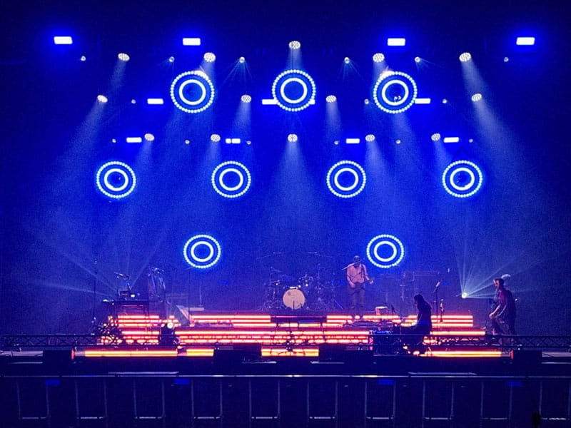 „Also suchte ich nach einer anderen Ausdrucksweise und erinnerte mich an die KNV Arc von GLP“, fährt er fort. „Diese Geräte sind zwar nicht mehr ganz neu, aber man hat sie eben auch noch nicht tausend Mal in Shows gesehen, sodass sie immer noch einen frischen Look bieten. Ich selbst habe die KNV Cube einmal genutzt, aber noch nie mit den KNV Arc gearbeitet. Im Gegensatz zu einer LED-Wand, die im ausgeschalteten Zustand wie ein grauer Klotz aussieht, machen die aus den KNV Arc geformten Kreise schon als rein physische Objekte etwas her. In Verbindung mit der Treppe sahen sie selbst im Arbeitslicht stimmig und stylisch aus. Definitiv ein schöner, unverbrauchter Stagelook.“