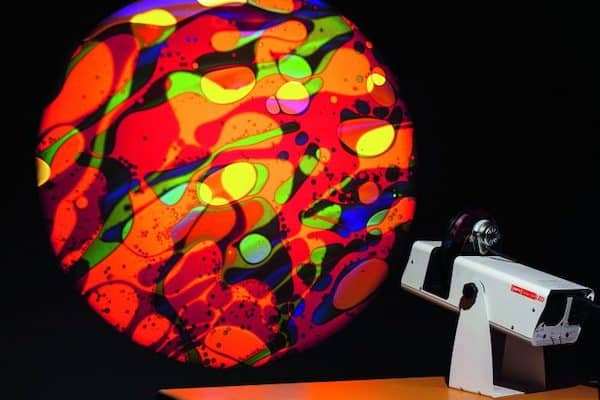 Ölräder: Öle, die zwischen drei runden Glas- oder Acrylscheiben eingebettet sind, werden von der Projektorlampe erwärmt, und während sich das Rad dreht, entstehen immer neue Muster. Diese werden bis heute von Optikinetics hergestellt. (Bild: Optikinetics)