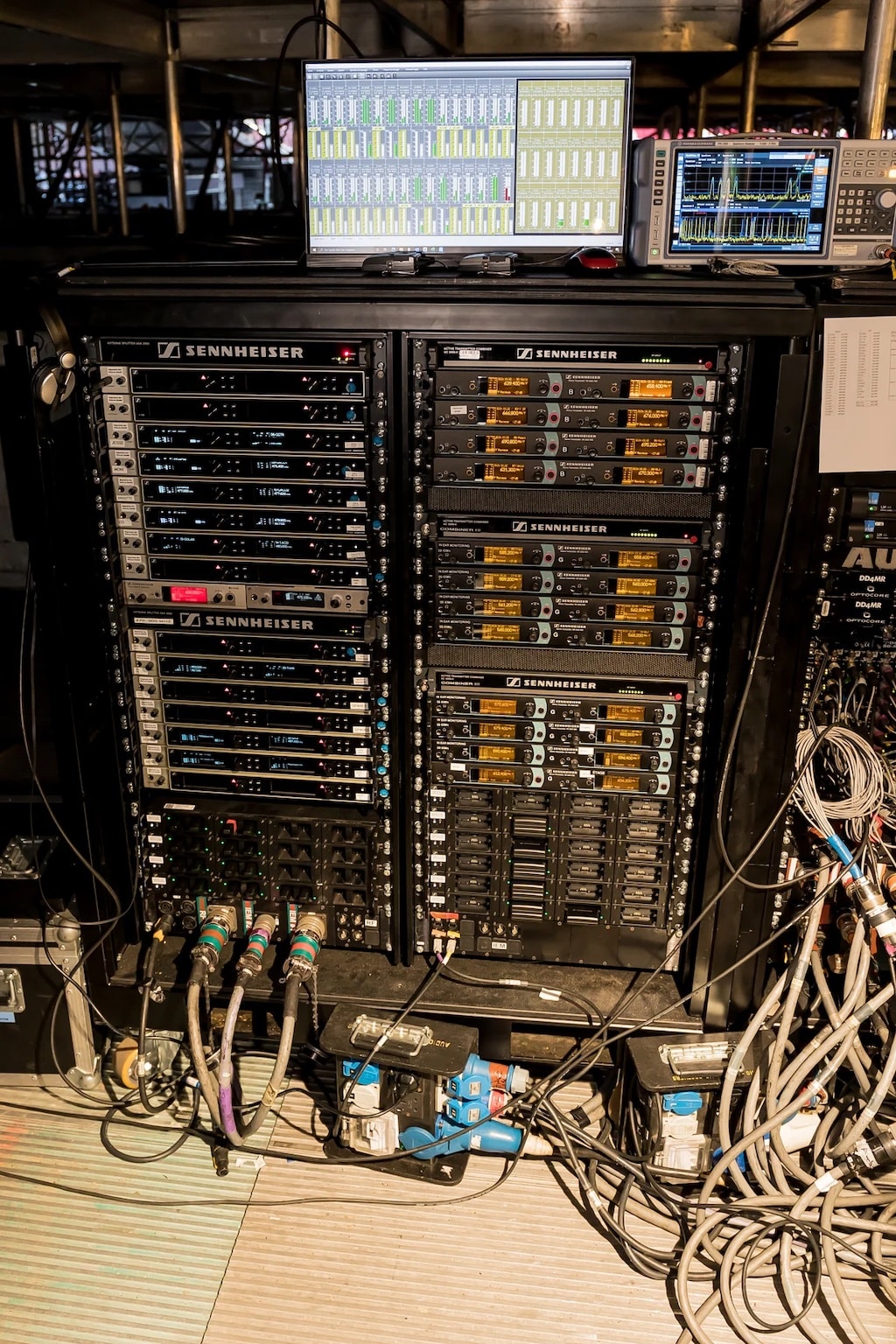 Für das drahtlose In-Ear-Monitoring setzte die Stadion-Großproduktion auf die Sennheiser 2000er Serie: Insgesamt 26 Kanäle wurden in den Frequenzsegmenten GW (558-626 MHz) und BW (626-698 MHz) übertragen, wofür die Crew ein mit SR 2050 IEM Rack-Doppelsendern gefülltes Rack an den Start gebracht hatte. Die HF-Ausgangssignale der IEM-Transmitter wurden in Vierergruppen mit aktiven Sennheiser AC 3200-II Antenna Combinern zusammengefasst und über verlustarme Ecoflex-Kabel auf zirkular polarisierte A 5000-CP Wendelantennen geführt, die eine vollständige Abdeckung der auf drei Ebenen bespielten Bühne sicherstellten.