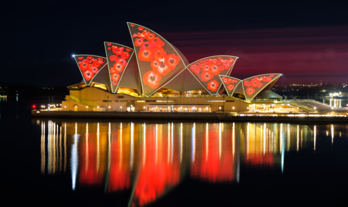 Die Segel des Sydney Opera House wurden in Erinnerung an den Remembrance Day mit animierten roten Mohnblumen bespielt(Bild: The Electric Canvas)
