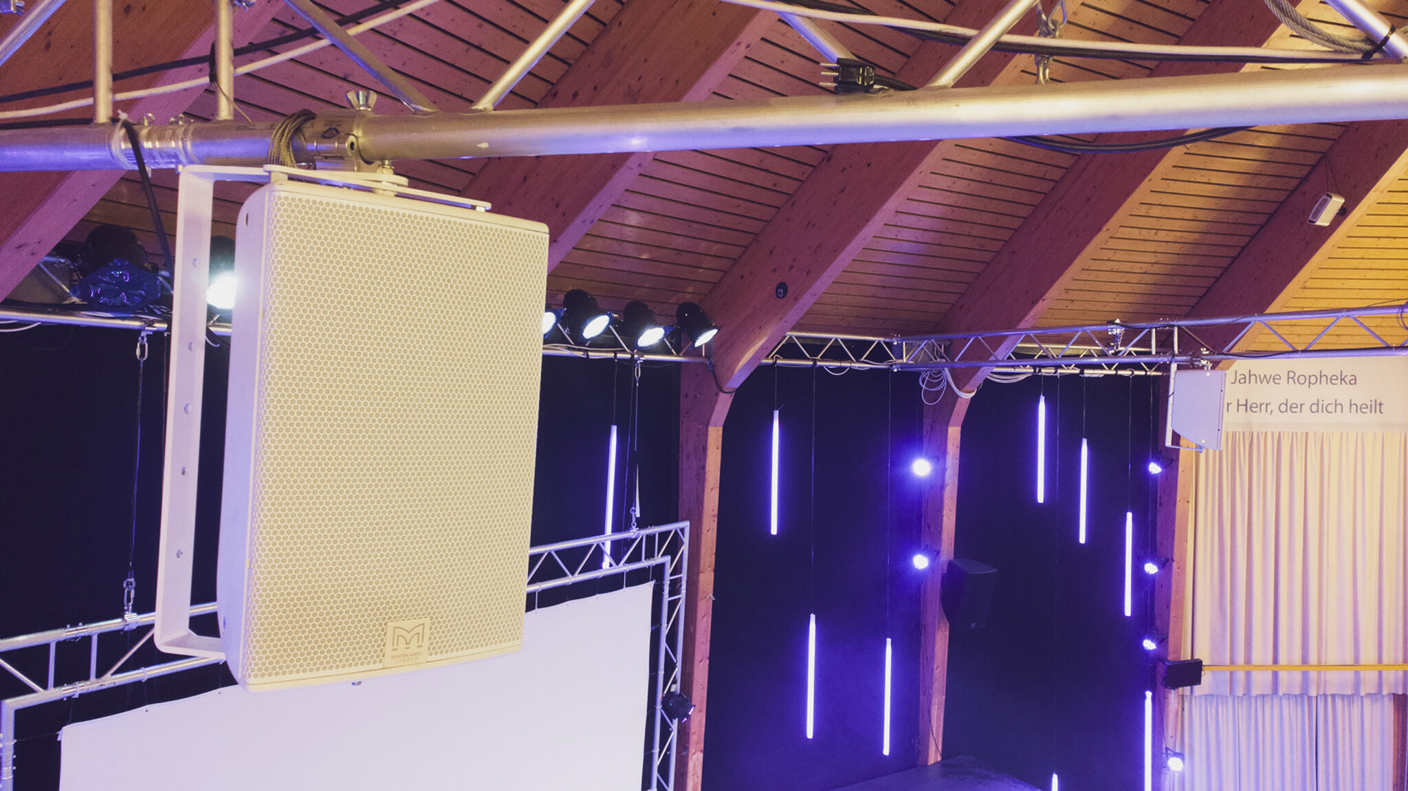 Nach vergleichendem Hören fiel die Entscheidung schließlich zugunsten von Martin Audio. Da es sich bei dem Kirchengebäude um eine Rotunde mit einer Empore handelt, wurde die Beschallungsanlage in Abschnitte unterteilt. Der Bereich vor der Bühne ist der größte abzudeckende Bereich (mit zwei CDD12s). Der obere Rang, der eine Glasscheibe als Brüstung nutzt, wurde mit zwei CDD10-Lautsprechern abgedeckt. Die Schwierigkeit habe darin bestanden, die Glasflächen so wenig wie möglich zu treffen, um Reflexionen zu vermeiden.