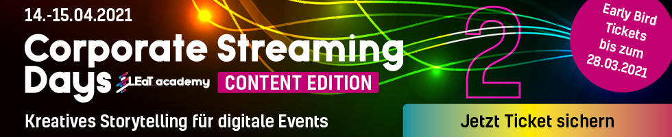 Das zweitägige digitale Seminarpaket kann noch bis zum 28. März unter www.leatcon.com/tickets zum Early-Bird-Preis von 189 Euro zzgl. MwSt. gebucht werden. Danach werden 229 Euro zzgl. MwSt. fällig. Alle Workshops der Corporate Streaming Days 2 sind im Anschluss zwei Wochen lang innerhalb der Buchung on demand abrufbar. Zu vielen Slots gibt es außerdem für jeden Teilnehmenden praktische Handouts und Checklisten.