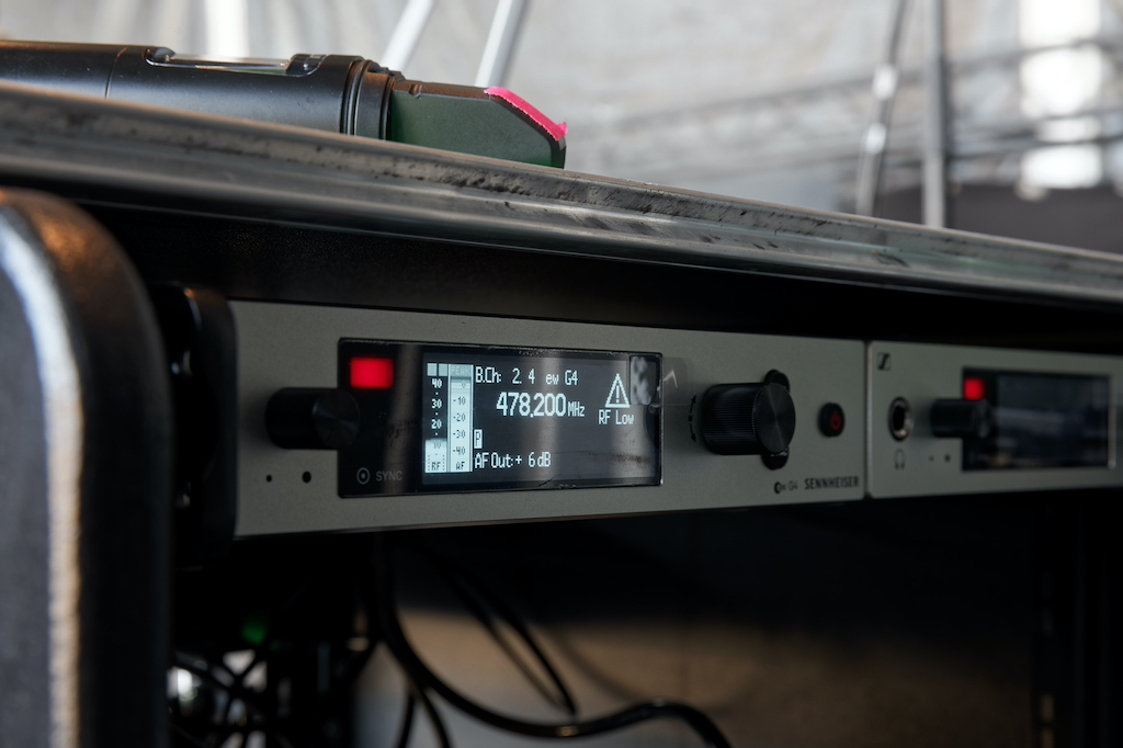 Als Empfänger für die Instrumente dienen zwei Sennheiser EM 300-500 G4 True-Diversity-Empfänger mit 88 MHz Schaltbandbreite