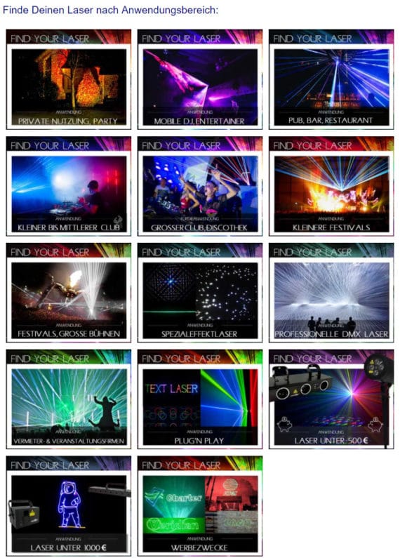 Es gibt eine große Zahl verschiedenster Showlasersysteme im Markt, und die Unterschiede sind gewaltig. Daher ist es nicht leicht das geeignete Lasersystem für einen bestimmten Anwendungsbereich zu finden. Das neue “Find your Laser”-Tool soll das Suchen geeigneter Lasersysteme basierend auf gewünschten Anwendungsbereichen oder aber auch rein nach technischen Daten vereinfachen.
