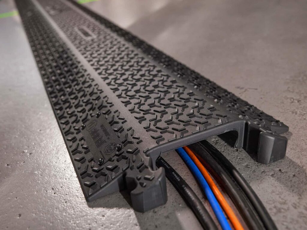 Die Dropover-Kabelbrücken mit einem Kabelkanal sind in zwei Ausführungen (Xpress 40 und Xpress 100) mit 40 mm und 100 mm breiten Kabelkanälen erhältlich und lassen sich über bereits verlegte Kabel und Schläuche legen. Auf diese Weise würden sich die Xpress Kabelbrücken für eine Vielzahl von Outdoor- und Indoor-Einsätzen eignen. Zudem verfügen die Xpress Modelle über die Defender 3D LaserGrip-Oberfläche für eine Rutsch- und Trittfestigkeit, auch beim Überfahren mit Rollwägen, Schubkarren oder Fahrrädern.