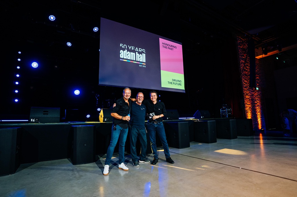 Feiern 50 Jahre Adam Hall Group: Markus Jahnel, Chief Revenue Officer, David Kirby, Co-Firmengründer, Alexander Pietschmann, CEO (Bild: Adam Hall Group)