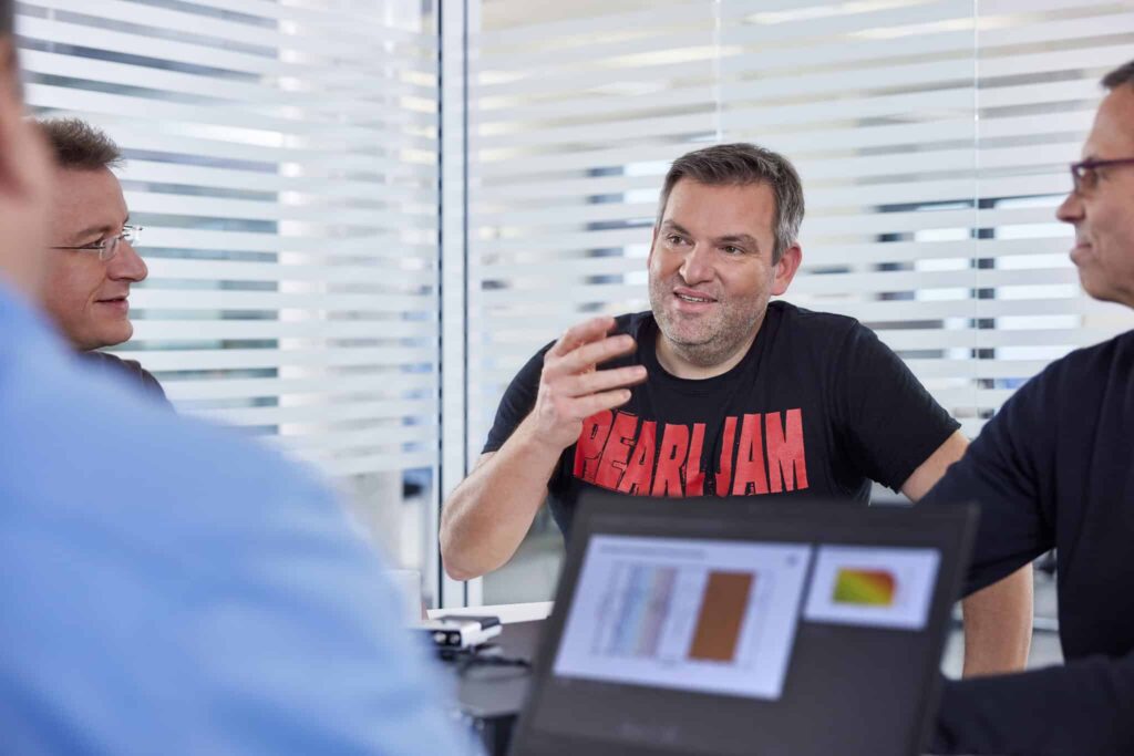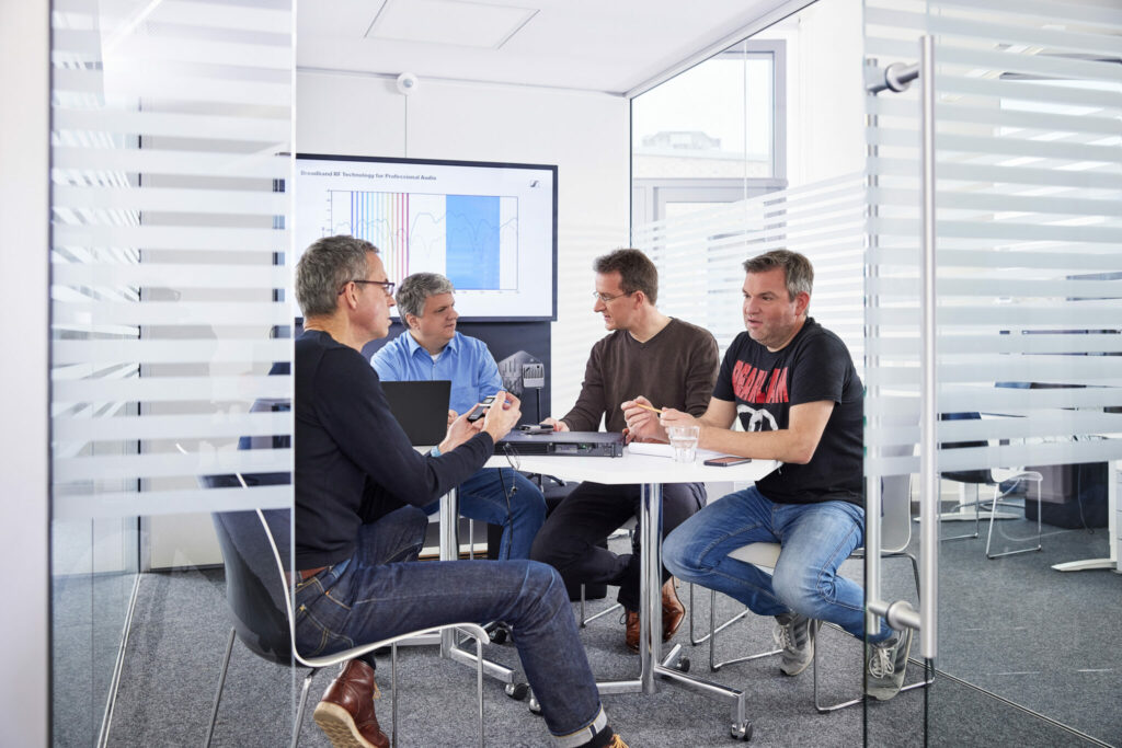 Dr. Andreas Wilzeck (Leiter Frequenzpolitik und Standardisierung), Martin Brandenburg (Projektmanager) sowie Dr. Sebastian Georgi und Jan Watermann – die beiden Forschungs- und Entwicklungsingenieure, die die sogenannten Wireless Multi-Channel Audio Systems (WMAS) erfunden haben – erläutern, welche Vorteile die neue Technologie biete und wie sie Drahtlosanwendungen revolutionieren werde.