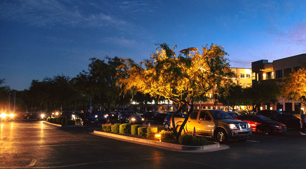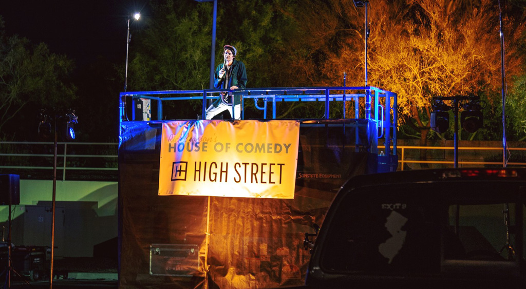 Chauvet Scheinwerfer beleuchteten die Bühne bei der „Drive-In Comedy Night“ im amerikanischen Phoenix, AZ. Auf dem Parkplatz der High Street Mall traten die Comedians Michael Longfellow, Joe Carden und Mike B Dapper auf, während das Publikum die Show in ihren Autos verfolgte.