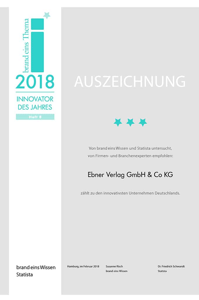 Die Auszeichnung in der Kategorie „Internet, Medien & Kommunikation“ belegt, dass der Ebner Verlag Vorreiter ist, wenn es um intelligente Produkte, Prozesse oder Dienstleistungen geht. Als besonders innovativ wurde der Ebner Verlag zusätzlich in den Bereichen Prozesse und Unternehmenskultur bewertet.