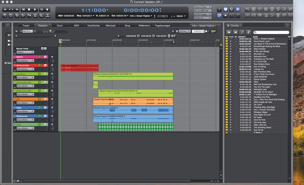 Musterprojekt der Chris Norman Band. Zu sehen sind rechts alle Chunks, sprich alle Songs eines Konzertes, zusammengefasst in einem einzigen Projekt.(Bild: Klemm Music Technology)