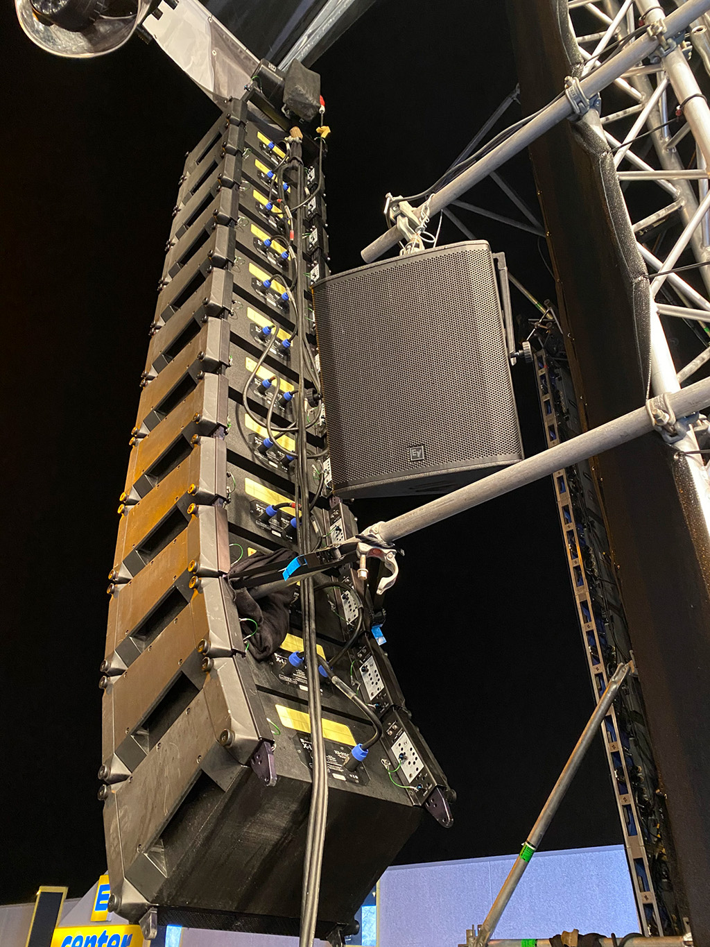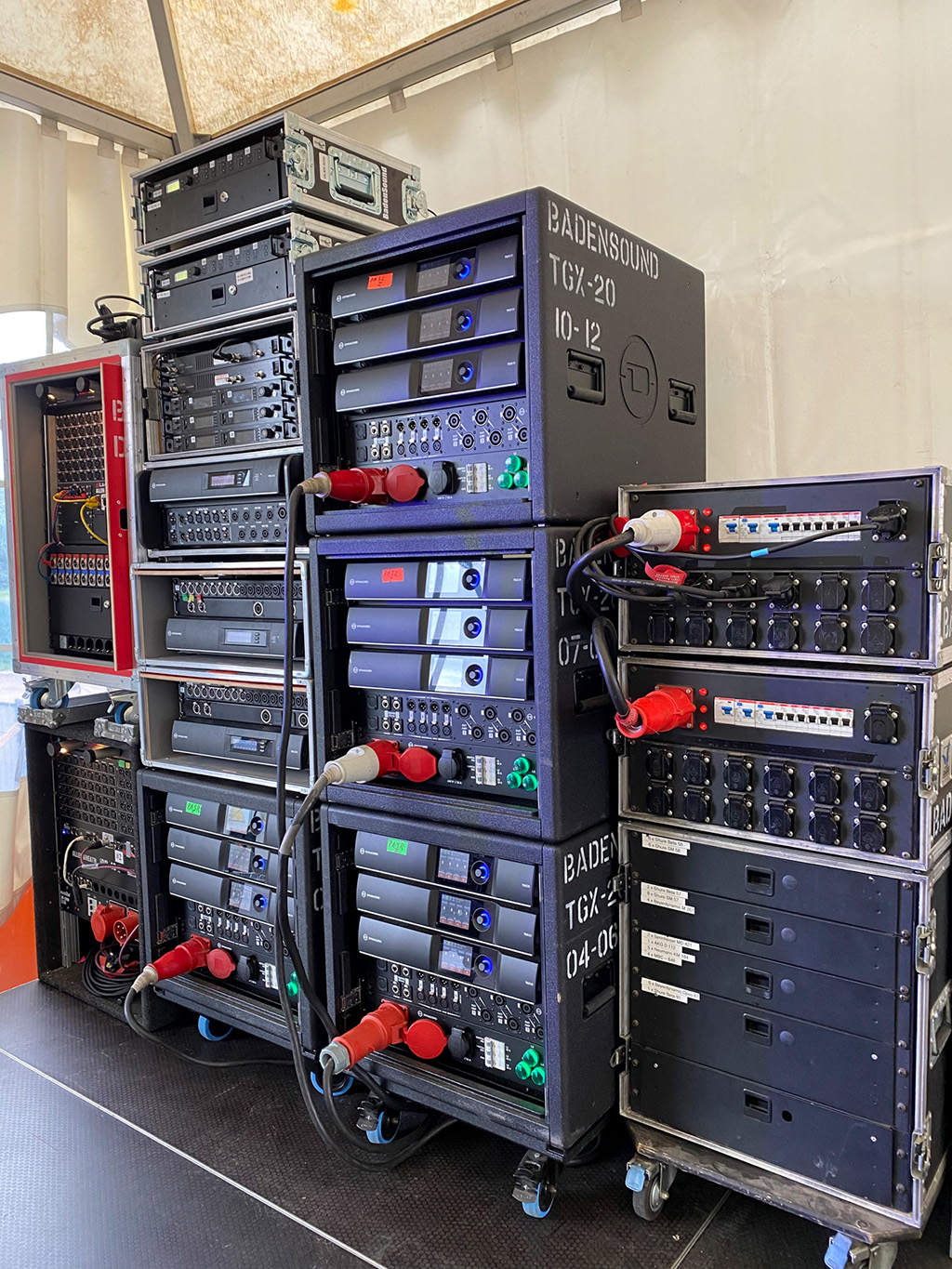 Für den kraftvollen Festivalsound setzte Badensound ein Electro-Voice X2 Line-Array als Main-PA ein. Das System bestand aus zwei Hangs mit jeweils 12 X2-212 Elementen pro Seite und wurde im Tieftonbereich von 16 X12-128 Subwoofern unterstützt. 12 Electro-Voice MFX-Multifunktionslautsprecher wurden als Stage-Fills und Bühnenmonitore eingesetzt, ergänzt durch Dynacord V17 Subwoofer und Cobra-Lautsprecher als Drum-Fills. Near- und Out-Fills bestanden aus weiteren 24 Electro-Voice XLE-Kompakt-Line-Array-Elementen.