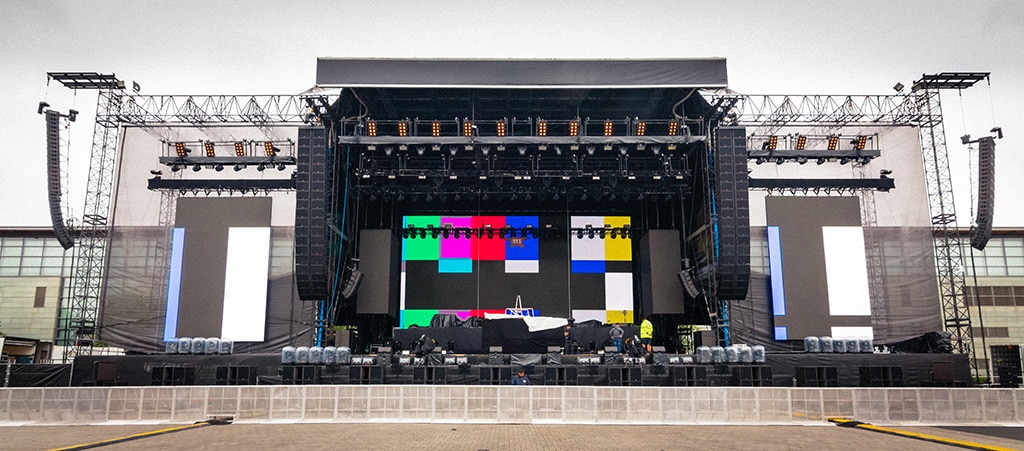 Neben dem Main-System aus jeweils 16×K1 und 4×K2 flankierten zwei weitere K1/K2-Arrays als Outfill die breite Bühne. Den Frontfill-Part teilten sich 3×2 Kara im Center-Bereich sowie 8×2 Kiva II, die auf Stativen zwischen den Subwoofer-Stacks platziert wurden. Auch im Outfill erhielten die Hangs Unterstützung am Boden in Gestalt von 4×ARCS pro Seite. Insgesamt vier Delay-Türme aus K1 und K2 sorgten für eine homogene Abdeckung auf dem großen Freifeld des Messegeländes.