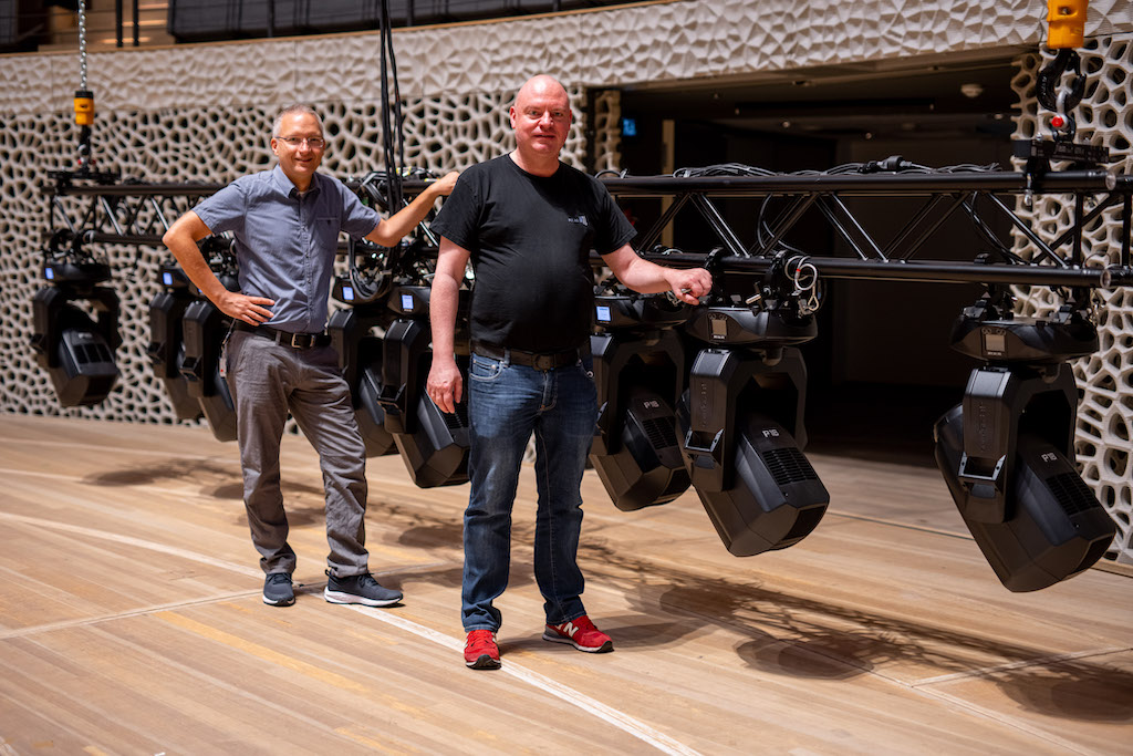 Mike Neumann (l. technische Produktionsleitung/Beleuchtungsmeister Elbphilharmonie) und Andreas Klöhn, Vertrieb Veranstaltungsstätten, PIK AG (Bild: Toni Kretschmer)