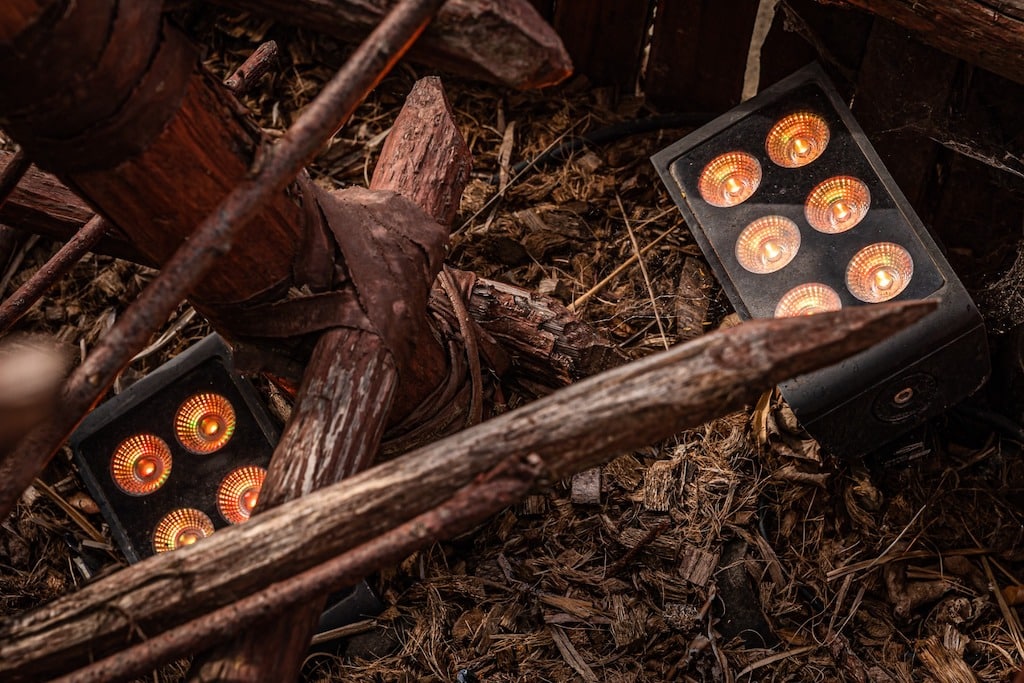Das Ambiente im Außenbereich entsteht durch insgesamt 11 Showtec Helix S5000 Q4 Flutlichter. Die Vintage-Atmosphäre des Fahrgeschäfts wird durch Showtec Spectral-Leuchten hervorgehoben, die strategisch über den gesamten Bereich verteilt sind, um Objekte zu akzentuieren sowie Feuer und brennende Fackeln zu simulieren. Cameleon Flutlichter beleuchten die beiden Brücken in weißem und farbigem Licht. Helix S5000 Q4 Washer und Spectral Spots beleuchten diverse Statuen, den Haupteingang des Fahrgeschäfts und den Eingang zum Shop. Mehrere Showtec Candela Pixelbars, die als Wandfluter verwendet werden, sorgen für zusätzliche Akzente im Außenbereich. Diverse Showtec Cameleon Flutlichter sind versteckt in die felsige Kulisse und die Umgebung integriert und tragen ebenfalls zur Ambientebeleuchtung bei.