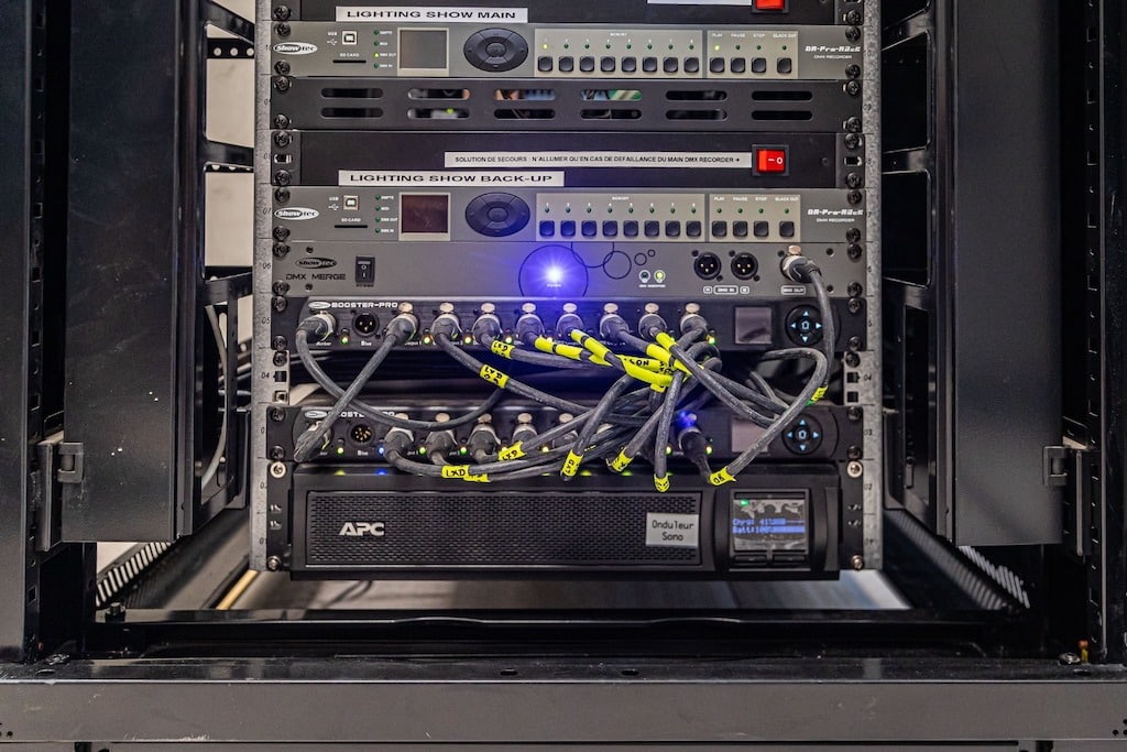 Hinter den Kulissen wird alles von zwei Showtec DR Pro Rack DMX-Recordern gesteuert, die als Haupt- und Backup-Gerät dienen. Der Showtec DMX Merge steuert bei Bedarf automatisch den Backup-Controller als DMX-Hauptquelle an. Unterstützt werden die Controller von zwei Showtec Booster Pro DMX-Splittern.