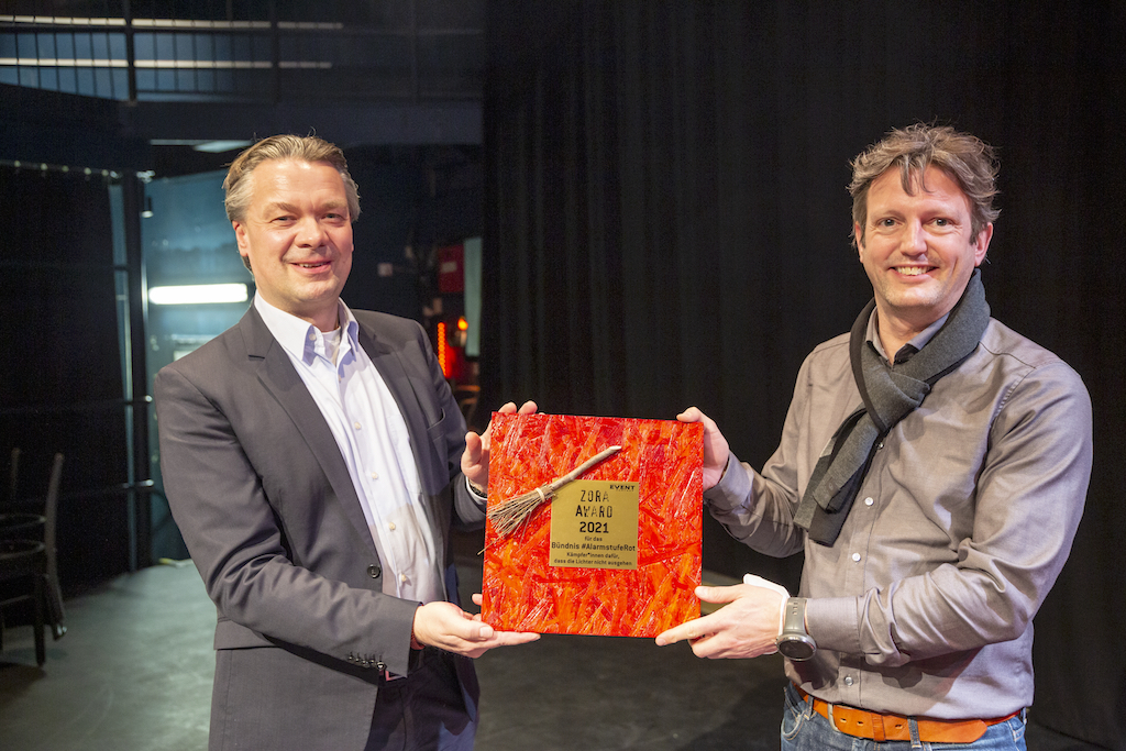 „Tausend Dank für den ZORA AWARD. Über 150 Berufsgruppen der Veranstaltungswirtschaft sitzen seit einem Jahr im selben Boot. Von Kultur- bis Wirtschaftsevents gilt: Sie sind in Seenot. #AlarmstufeRot bekommt den Preis für das Vereinen des Wirtschaftszweigs. Dieses Signal ist uns wichtig. Soloselbstständige, Mittelständler, Community und Fachverbände legen sich gemeinsam in die Riemen, um unser schönes Boot zu retten. Stellvertretend für sie alle nehmen wir den Preis dankbar an und versprechen: #AlarmstufeRot kämpft weiter!“ so die Mit-Initiatoren Christian Seidenstücker und Alex Ostermaier, die den Preis entgegennahmen.