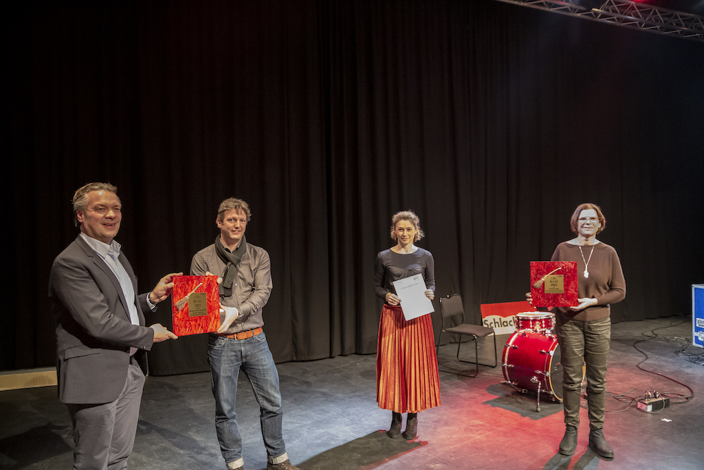 Christian Seidenstücker, Alex Ostermaier, Martina Courth und Kristina Vogt (v.l.) bei der Übergabe des ZORA AWARDs 2021 (Bild: Marcel Courth)