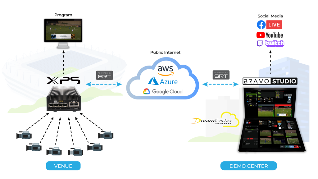 Mit „XPS“ lassen sich Video-Feeds in Broadcast-Qualität über das Internet von einem Veranstaltungsort beispielsweise zum „DCTC“ München senden. Gleichzeitig kann der Dream Catcher-Ausgang über SRT zurück zum Veranstaltungsort gestreamt oder aber mittels RTMPS direkt in den sozialen Medien veröffentlicht werden.