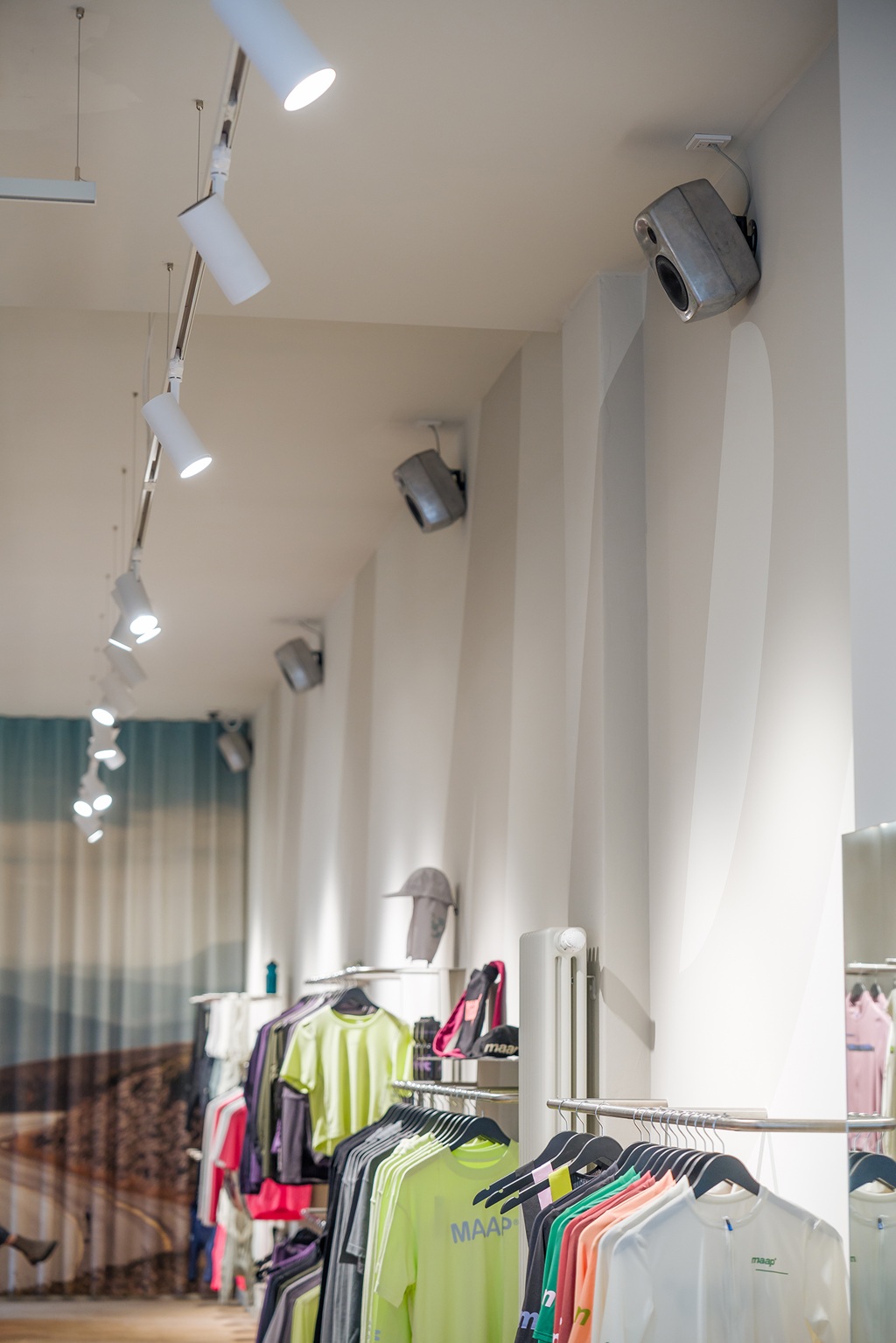 Die Klanglandschaften im Berliner LaB spiegeln sowohl die lebendige elektronische Musikkultur der Stadt als auch die Markenidentität von MAAP wider – energiegeladen und doch raffiniert. „Unser Ziel war es, die Energie Berlins zu vermitteln und gleichzeitig dem Ethos von MAAP treu zu bleiben“, erklärt Ward. „Der Klang beeinflusst, wie Kunden den Raum und damit auch die Marke wahrnehmen. Das Feedback war überwältigend positiv. Kunden haben uns gesagt, dass der Klang den Raum lebendig macht. Das ist das größte Kompliment – es bedeutet, dass das System seinen Zweck erfüllt.“