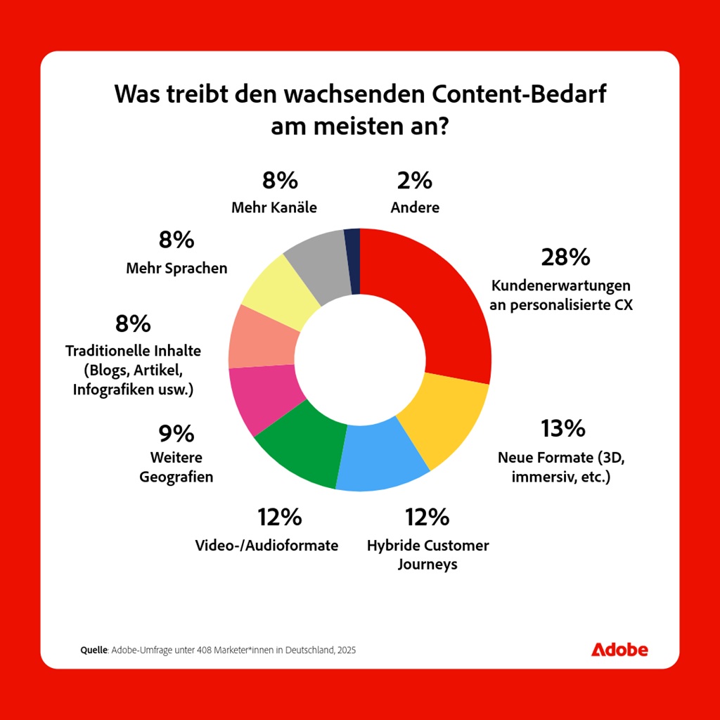 Die Nachfrage nach Inhalten explodiert – und setzt Marketingteams zunehmend unter Druck. Laut einer aktuellen Adobe-Studie unter 408 deutschen Marketerinnen berichten 80 Prozent von einem Anstieg der Content-Nachfrage in den letzten zwei Jahren, fast jeder Zweite sogar von einer Verfünffachung. Bis 2027 erwarten 71 Prozent der Befragten eine weitere Verdopplung.