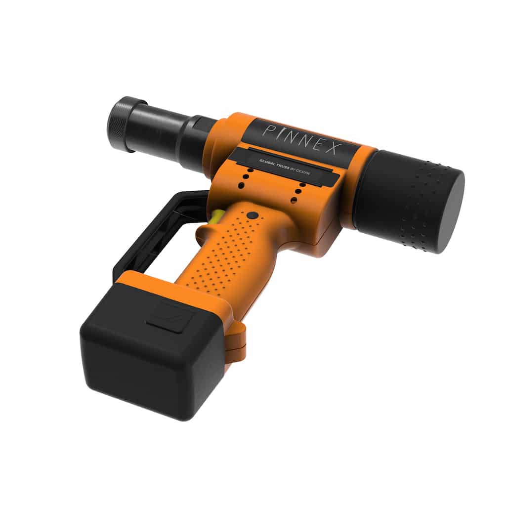 Das Pinnex System besteht aus einem eigens entwickelten Pin (Stahl 8.8) und einer Zange. Letztere wurde so konstruiert, dass sie die Pins schnell und leise greift sowie ohne großen Kraftaufwand aus der Traverse zieht. Dabei hält die Zange die Pins fest, bis der Anwender den Griff löst.