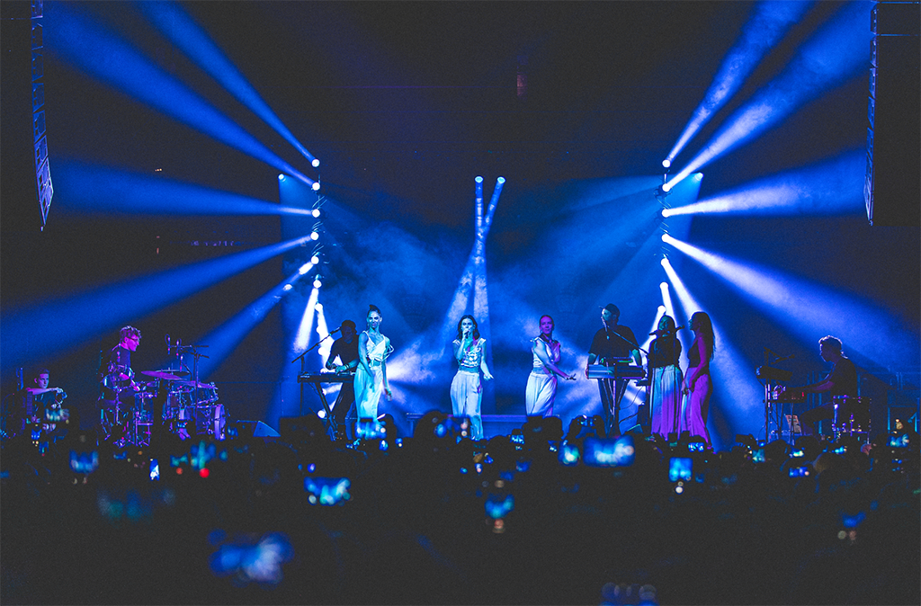 Die X4 Bar, eines von JoJos „Lieblingslichtwerkzeugen“, ordnete er wie die Sprossen einer Leiter übereinander an und platzierte die Konstruktion direkt hinter dem Podest. „So wirkten die einzelnen Bars wie ein großer Lichtspiegel“, erklärt er. Grundsätzlich sei die X4 Bar „der Hit und ein wirklich einzigartiges Fixture“. Kaum ein Lichtdesign kommt ohne die vielseitigen LED-Bars aus. Eingefasst wurden die Bars von zwei vertikalen Säulen aus jeweils sechs GLP KNV Arc links und rechts. „Diese Anordnung tauften wir liebevoll die ‚Palme‘“, erinnert sich der Designer.