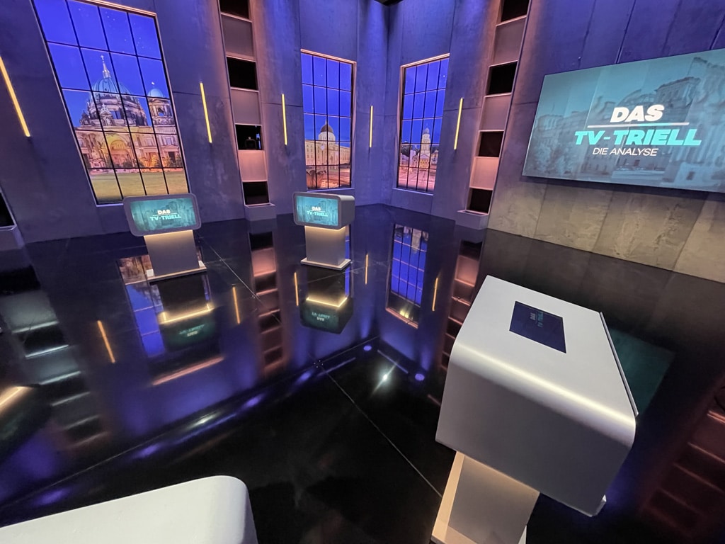 Am 19. September 2021, eine Woche vor der Bundestagswahl, fand das letzte TV-Triell der Kanzlerkandidatin Annalena Baerbock und ihrer Mitbewerber Armin Laschet und Olaf Scholz statt. Ausrichtende Sender waren ProSieben, Sat.1 und Kabel Eins. Lichtdesigner Jerry Appelt setzte das 360°-Set mit GLP Impression S350 Wash und Spot, X4 Bar und X4 L rundum kameratauglich in Szene.