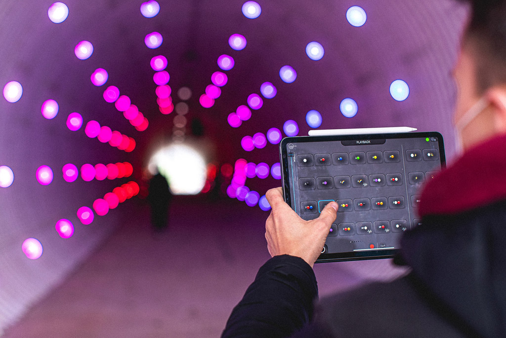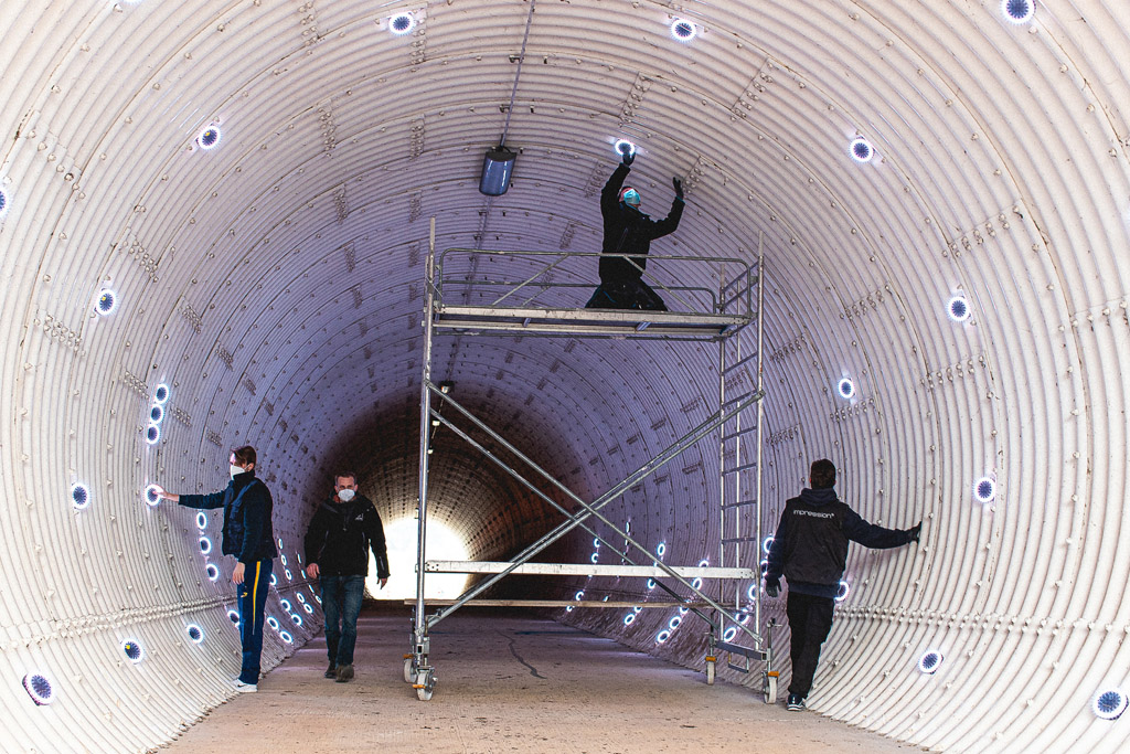 Nachdem die Voraussetzungen für die Umsetzung mit den Behörden abgestimmt worden waren (Sperrung des Tunnels für Fußgänger, Abschaltung der Beleuchtung und Hygienekonzept), begann eine fünfköpfige GLP-Crew am Nachmittag des 23. März mit dem Aufbau. Mit Hilfe eines Nivellierlasers und eines Rollgerüsts konnten binnen weniger Stunden über 200 GLP Creative Light 1 exakt ausgerichtet an der Tunnelwand angebracht werden. Anschließend wurde das DJ-Set aufgebaut, und die Programmierung der Lichtshow erhielt den letzten Feinschliff.