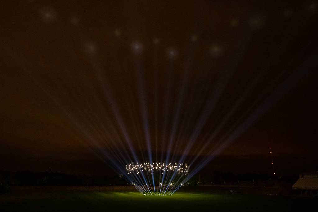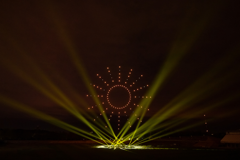 Aus 24 GLP Fusion Exo Beam im Wechsel mit anderen Beam-Scheinwerfern kreierte Jens Hillenkötter, Executive Creative Producer der Show, einen Lichtkreis mit 30 Metern Durchmesser, der gleichzeitig den Start- und Landepunkt aller Drohnen markierte. Ihre größten Auftritte haben die kompakten Beamlights dementsprechend während des Starts und der perfekt inszenierten mehrstufigen Landung der Drohnen.