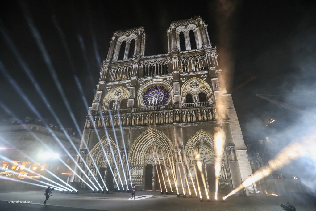Neben der Festinstallation der AV-Technik verantwortete die Groupe Novelty auch die technische Umsetzung der Wiedereröffnungszeremonie – inklusive Licht, Ton, Video und Stromversorgung. Mehr als 200 Scheinwerfer von Martin, Elation und Robe, ergänzt durch 200 Geräte von Astera, Martin, Robe und ARRI, tauchten die Kathedrale in goldenes Licht. Die Steuerung erfolgte über MA Lighting grandMA3.