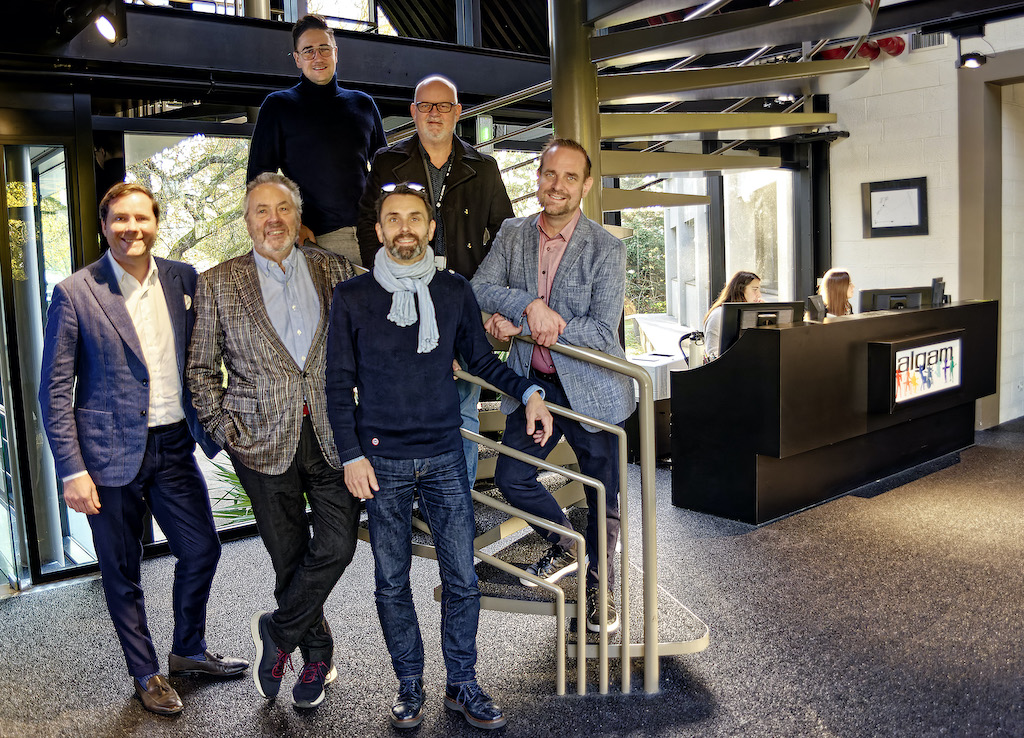 Vorne v.l.n.r. Benjamin Garnier (CEO Algam), Gérard Garnier (President Algam), Stephane Pataud (Division Director Algam Audia) Hinten: Marco Zeidler (Head of Sales Western Europe), Thomas Garin (BDM HK Audio), Christian Jordan (CEO/CMO HK Audio) (Bild: PHOTO STUDIO ALGAM)