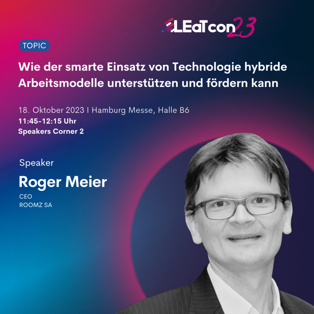 Roger Meier, CEO von ROOMZ SA, beleuchtet auf der LEaT con 2023 die Frage, wie Technologie sinnvoll eingesetzt werden kann, um hybride Arbeitsmodelle optimal zu unterstützen.