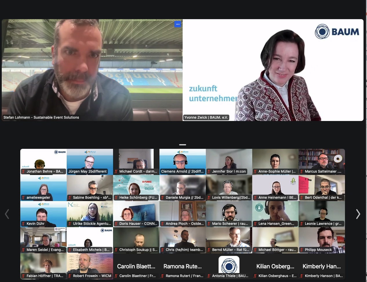 Zu den einzelnen Schwerpunkten erhielten die Teilnehmenden Impulse von Fachexpert:innen. Sie zeigten den Teilnehmenden praxisnahe Wege auf, um nachhaltige Lösungen in den Veranstaltungsalltag zu integrieren. Zu jedem Impuls gab es dann eine Breakoutsession, in der die Inhalte gemeinsam mit den Expert:innen vertieft und kurz-, mittel- und langfristige Ziele der nächsten Monate definiert sowie die Arbeitsgruppenleiter:innen gewählt wurden.