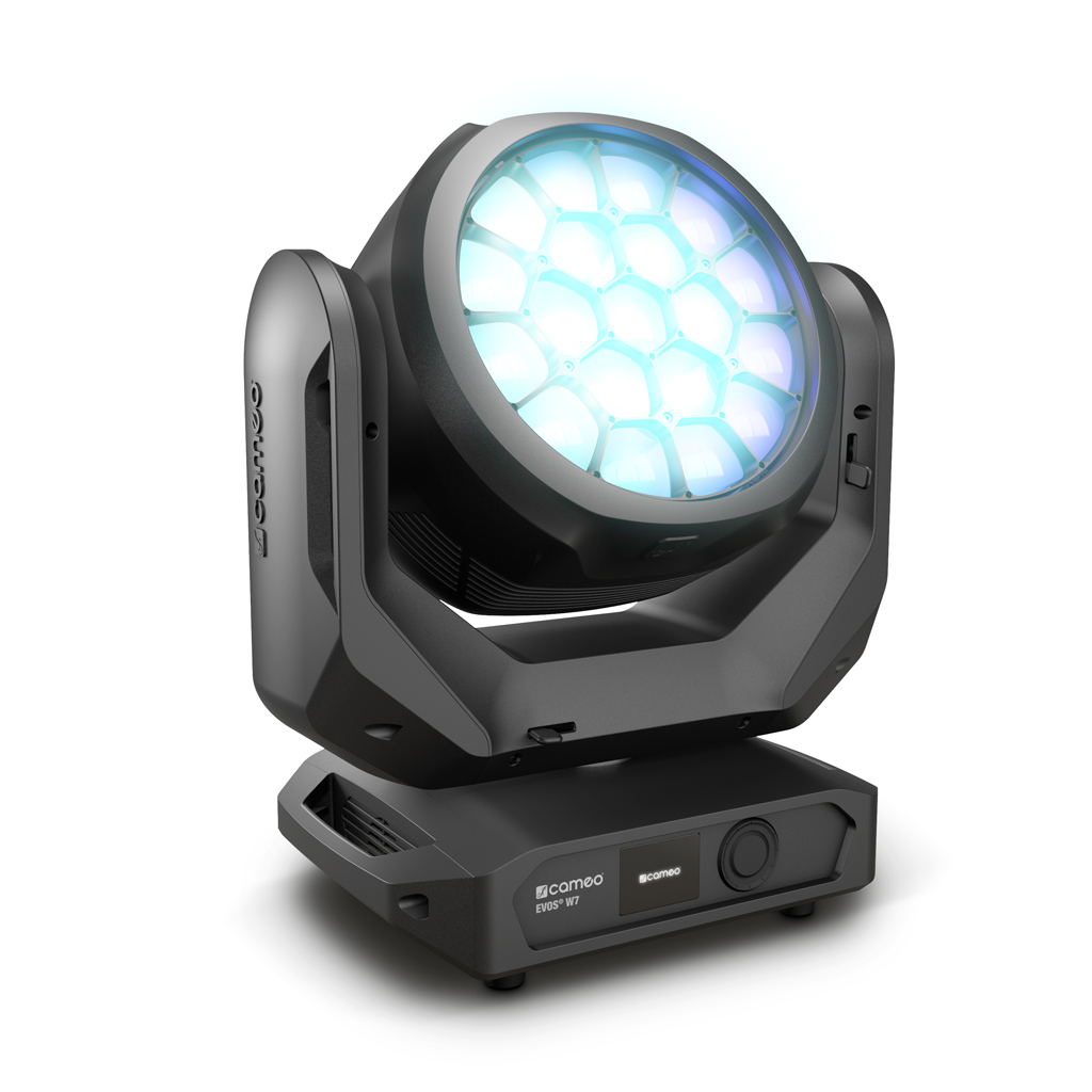 Der Evos W7 ist ein LED-WashBeam-Moving-Head mit insgesamt 19×40 W RGBW- und warmweißen LEDs – für RGB-Farben, Pastelltöne und Lichteffekte. Mit einer Lichtleistung von 10.500 lm soll der Evos W7 Events, Personen und Objekte in warme, leuchtende und klar definierte Farben (CRI > Ra90) tauchen und hat eine Ausleuchtung bis 540° horizontal (Pan) und 270° vertikal (Tilt) aus. Der Zoom-Bereich von 4,5° bis 55° ermöglicht sowohl gezielte Beleuchtungseinsätze als auch großflächige Wash-Effekte, wobei die Abstrahlung mittels Beam Shaper (inklusive) asymmetrisch gerichtet werden kann. Darüber hinaus erlaubt die Single Pixel Control-Funktion die individuelle Steuerung sämtlicher LEDs für Pixel-Effekte. Und auch Live-Übertragungen von Veranstaltungen sollen mit dem Cameo Evos W7 WashBeam-Moving-Head flimmerfrei gelingen, denn die Wiederholrate des Scheinwerfers lässt sich in sechs Stufen von 800 Hz bis 25 kHz einstellen. Die Software-Steuerung via Netzwerk kannl per W-DMX-Transceiver sowie DMX, RDM Art-Net3, sACN oder KlingNet erfolgen.