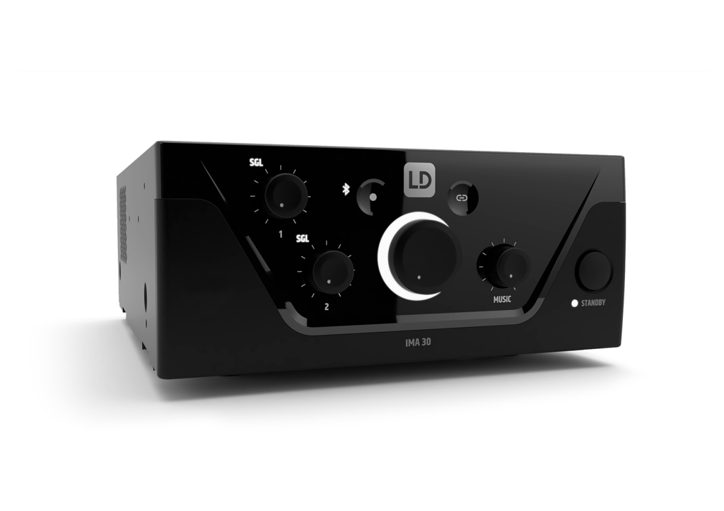 Der IMA30 ist der erste einer Reihe von Mischverstärkern der neuen IMA-Serie von LD Systems, die speziell für Festinstallationen entwickelt wurde. Mit seinen  Eingangs- und Ausgangsoptionen und der mehrstufigen Priority-Schaltung soll der IMA30 flexibel in kommerzielle und industrielle Anwendungen integriert werden können. Der Verstärker kommt in einem 9,5″-Chassis mit 2 HE und verfügt über zwei Mic/Line-Ausgänge mit +24-V-Phantomspeisung, zwei Stereo-Line-Eingänge, einen Bluetooth-Eingang zur Einbindung drahtloser Zuspielquellen und einen Priority-Eingang für Notrufe. Ausgangsseitig ist der IMA30 mit einem spannungsversorgten Ausgang mit 30 W an 4 Ohm sowie einem 70/100-V-Ausgang plus Klangsteuerung mit Bass- und Höhen-Regelung ausgestattet. Zur Optimierung des Frequenzgangs bei niederohmigen Anwendungen kann das Ausgangssignal mittels Low-Z/High-Z-Wahlschalter komplett vom Ausgangsübertrager getrennt werden. Über den separaten Aux-Line-Ausgang kann der IMA30 außerdem mit externen Verstärkern, Subwoofern oder Systemen für Warteschleifenmusik kombiniert werden. Per Mix-Wahlschalter für die Musikmischung lässt sich festlegen, ob die gesamte Mischung oder nur die ausgewählte Musikquelle an den Ausgang überführt wird.