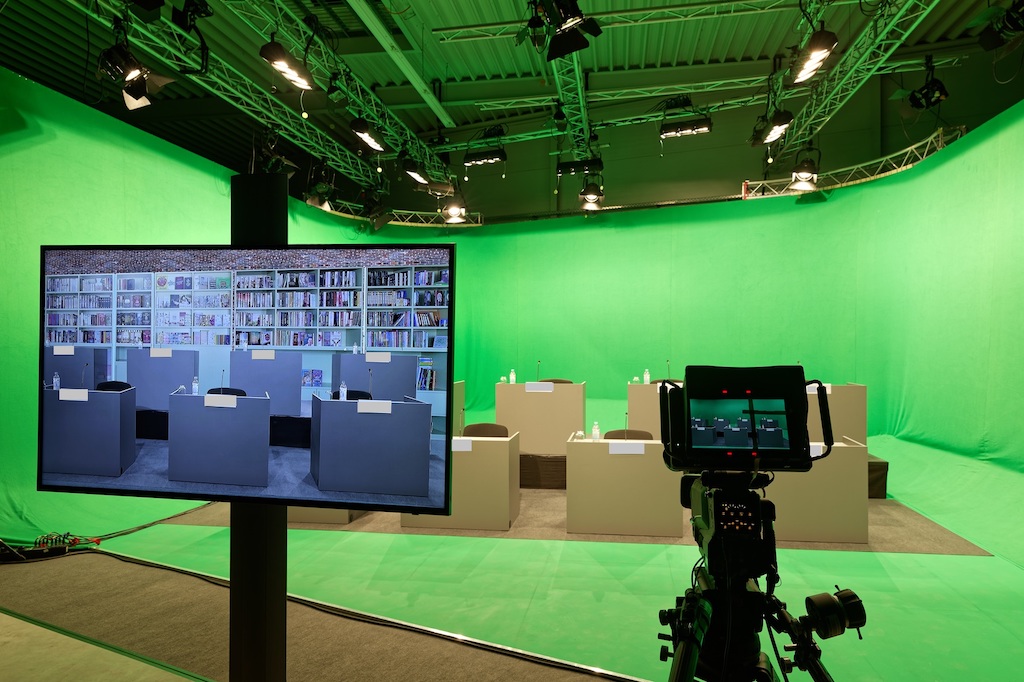 Bei einer Greenbox wird mithilfe der Greenscreen-Technik virtuell eine Umgebung erzeugt, die auf Betrachter am Bildschirm authentisch wirkt. Die farbbasierte Bildfreistellung ist ein etabliertes Verfahren aus der Film- und Fernsehtechnik: Gegenstände oder Personen können vor beliebigen Hintergründen positioniert werden, welche entweder auf realen Bild- bzw. Filmaufnahmen (beispielsweise hier eine auf Kundenwunsch gefertigte Bibliothek) oder auf Computergrafiken (wie bei den allseits bekannten Nachrichtensendungen) basieren. 3D-Renderings in Echtzeit dienen in diesem Zusammenhang als besondere Blickfänger.