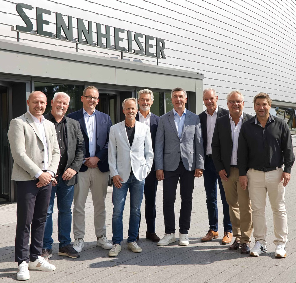 Marten Kirstein (Director Business Management, Kern & Stelly), Christoph Van den Berghe (Vice President Sales EMEA – Pro Audio, Sennheiser), Frederik Bartels (Geschäftsführer, Kern & Stelly), Dr. Andreas Sennheiser (CEO, Sennheiser), Ron Holtdijk (Executive Vice President Business Communication, Sennheiser), Gerd Holl (Regional Director DACH, Geschäftsführer Kern & Stelly), Peter Limmen (Vice President Sales EMEA – BizCom, Sennheiser), Sebastian Schull (Business Development Director DACH – Pro Audio, Sennheiser) und Christian Carrero (Director ProAudio & Solutions DACH, Kern & Stelly) (v. l. n. r.). (Bild: Kern & Stelly)